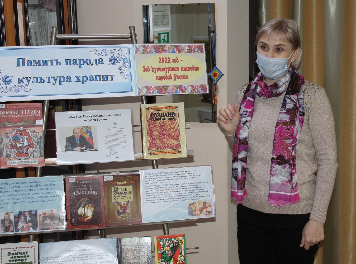 В ходе мероприятия библиотекарь рассказала присутствующим о значении Года культурного наследия для России, о сохранении культурных традиций, о многообразии культурной самобытности народов России, и представила книжную выставку «Память народа культура хранит». Представленные книги помогут читателям погрузиться в неповторимый мир фольклора, познакомиться с художественными промыслами народов России. Также был представлен буклет «Частушка – живое наследие предков», в котором рассказывается история возникновения частушек, интересные факты о этом виде устного народного творчества.