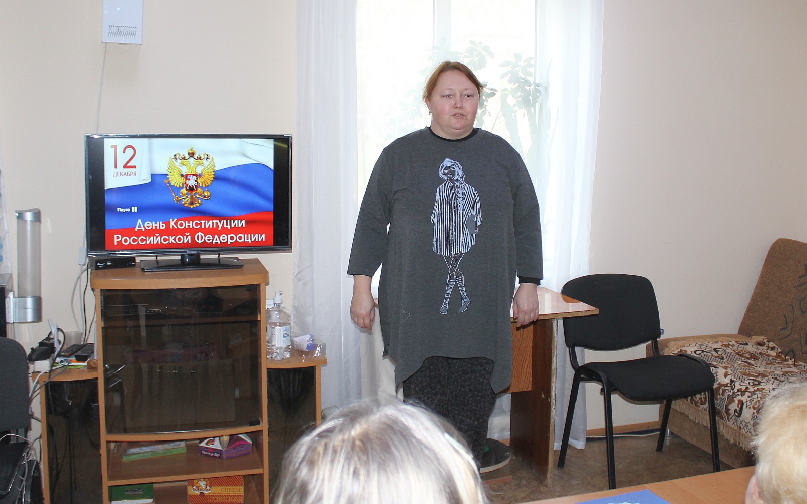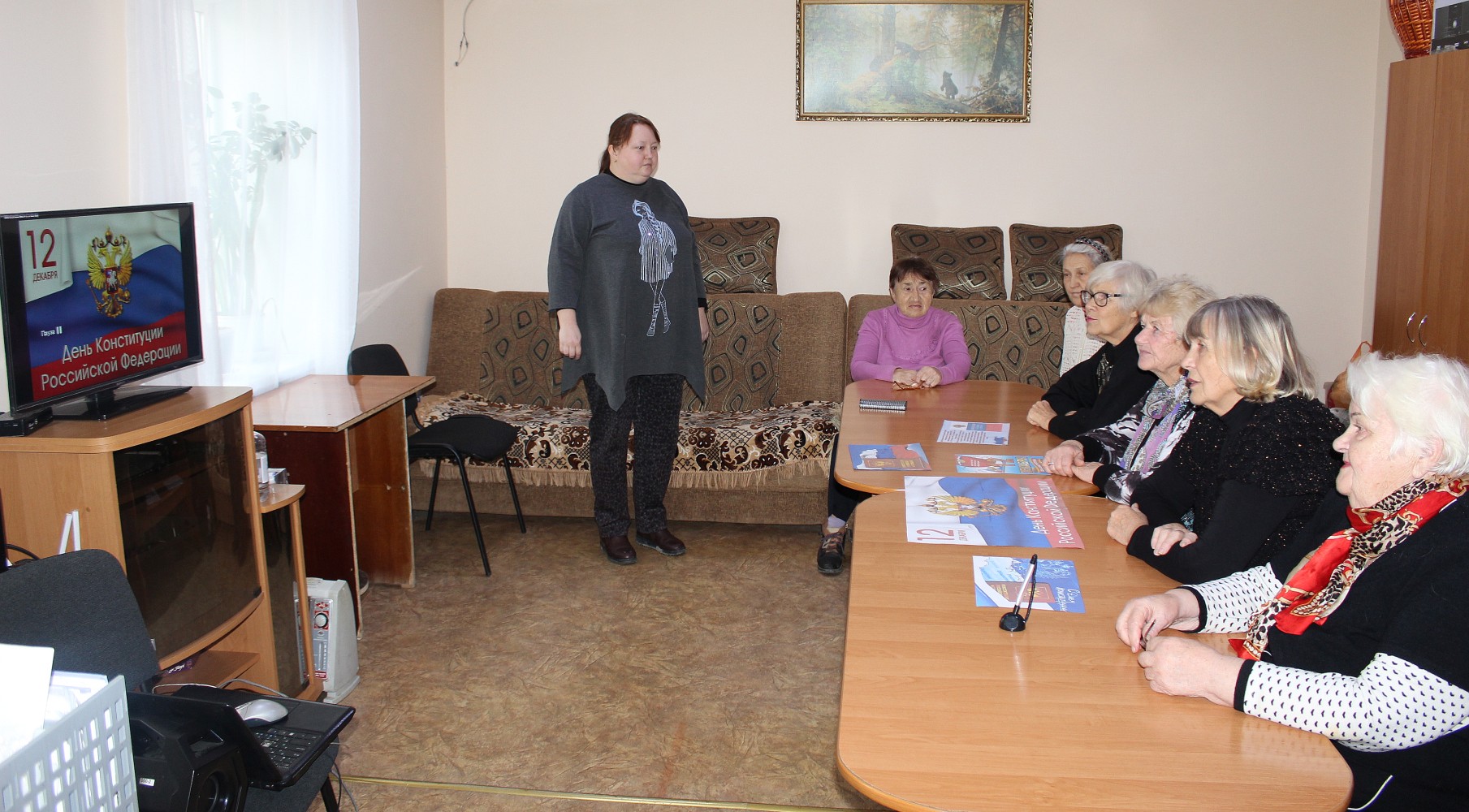 Культорганизатор Ольга Тюнегова рассказала о событиях, связанных с разработкой и принятием ныне действующей Конституции РФ, об учреждении государственного праздника — Дня Конституции России и кратко напомнила присутствующим главные положения основного закона страны.