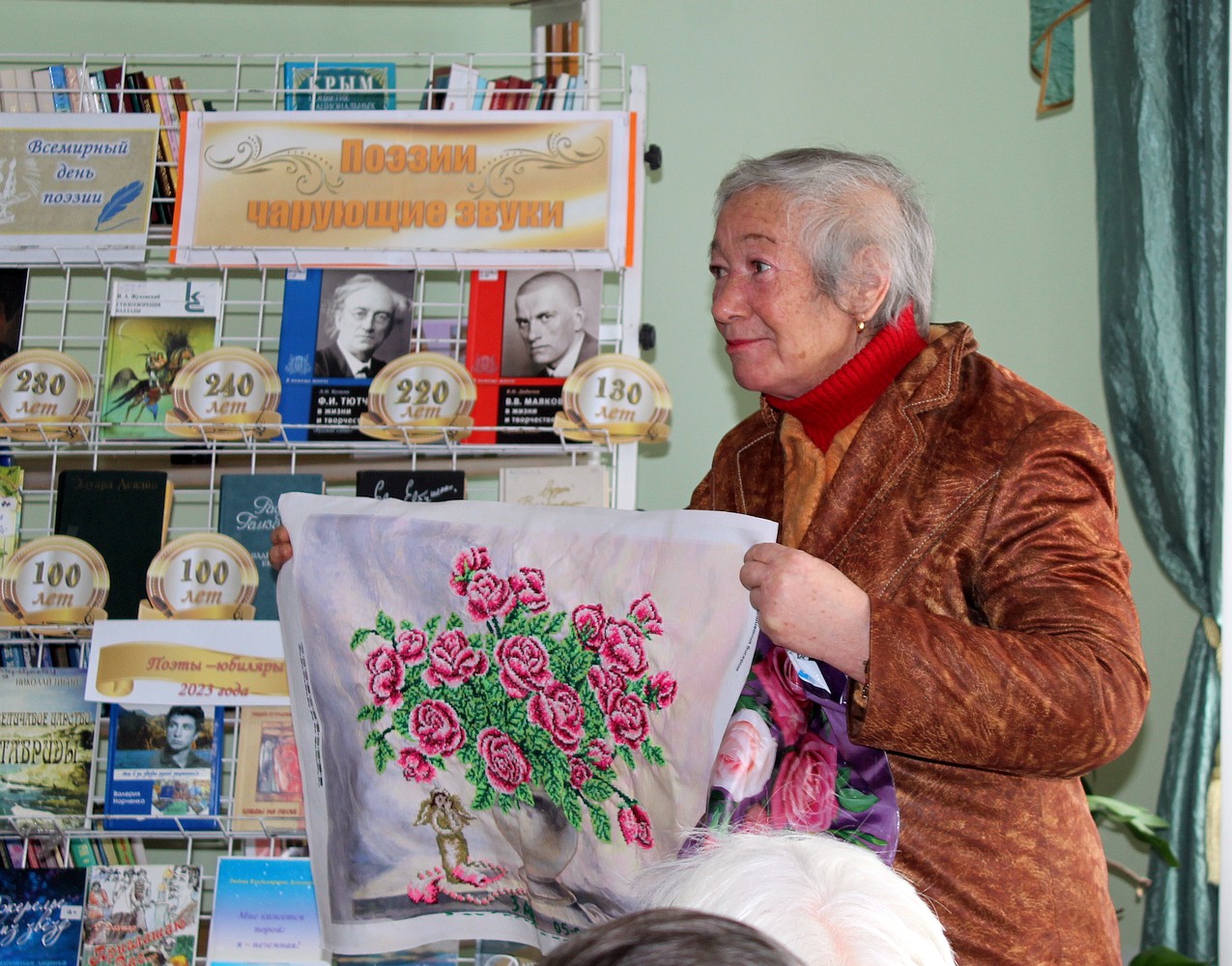 В ходе встречи присутствующие с удовольствием вспоминали и читали строки известных поэтов: А. С. Пушкина, М. Ю. Лермонтова, С. Есенина, Ф. Тютчева и других. Дополнением к мероприятию послужила книжная выставка «Поэзии чарующие звуки».