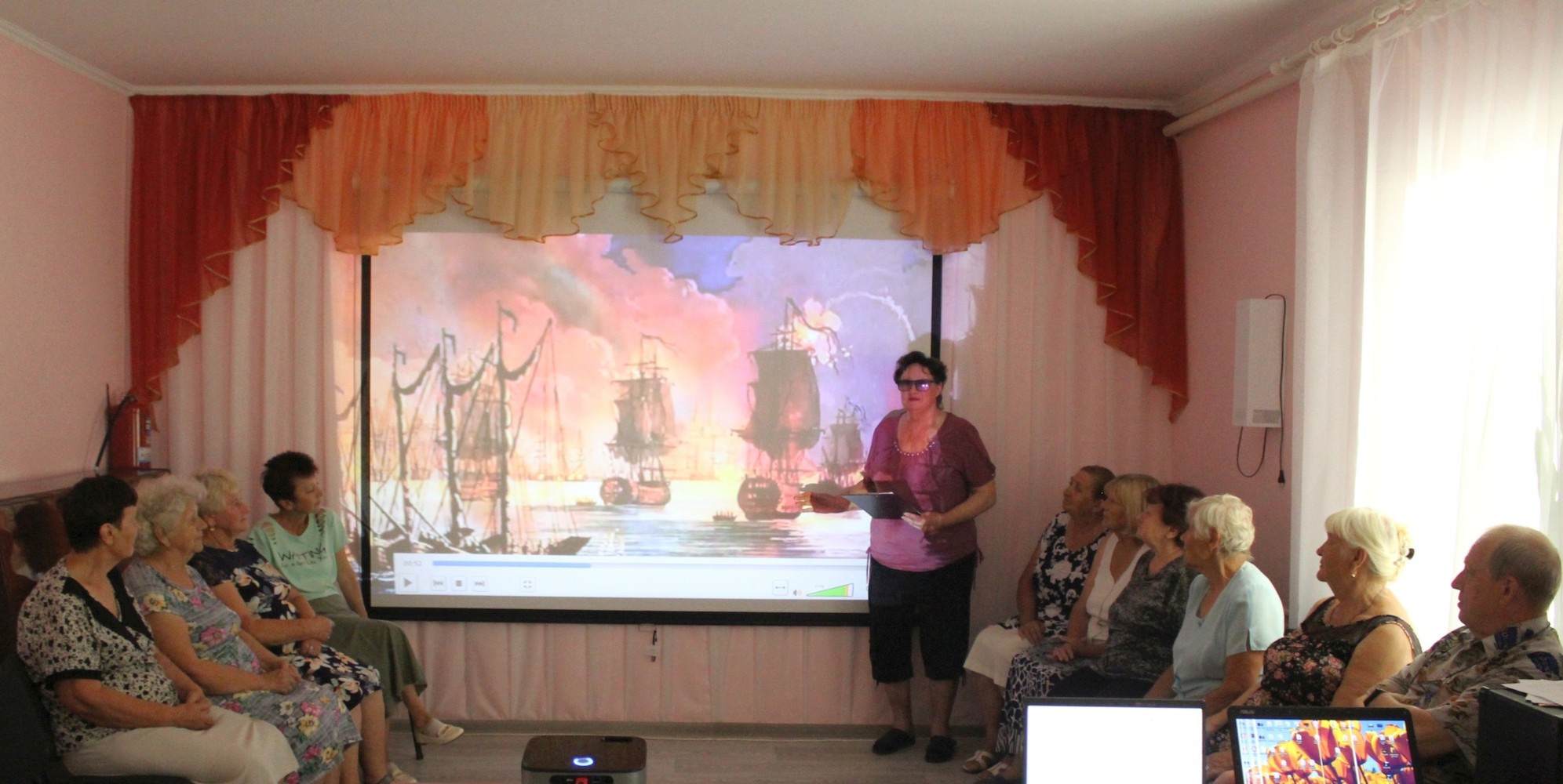 7 июля 2023 года в рамках проекта «Старшее поколение», в отделении дневного пребывания граждан пожилого возраста и инвалидов ГБУ РК «ЦСО Раздольненского района» прошел час истории c просмотром видеороликов для получателей социальных услуг и серебряных волонтеров, посвященный Дню воинской славы России —дню победы русского флота над турецким флотом в Черноморском сражении (1770 год).