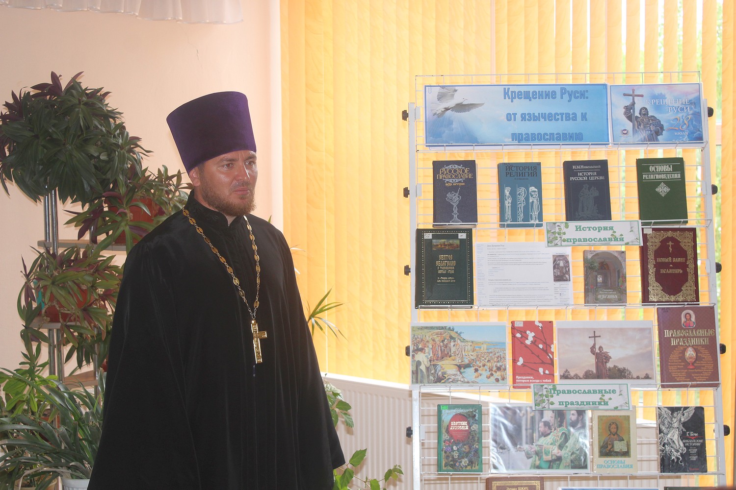 Библиотекарь представила книжную выставку «Крещение Руси: от язычества к православию», на которой представлена литература, знакомящая читателей с историей православии, святынях православия, православных обрядах и многом другом.