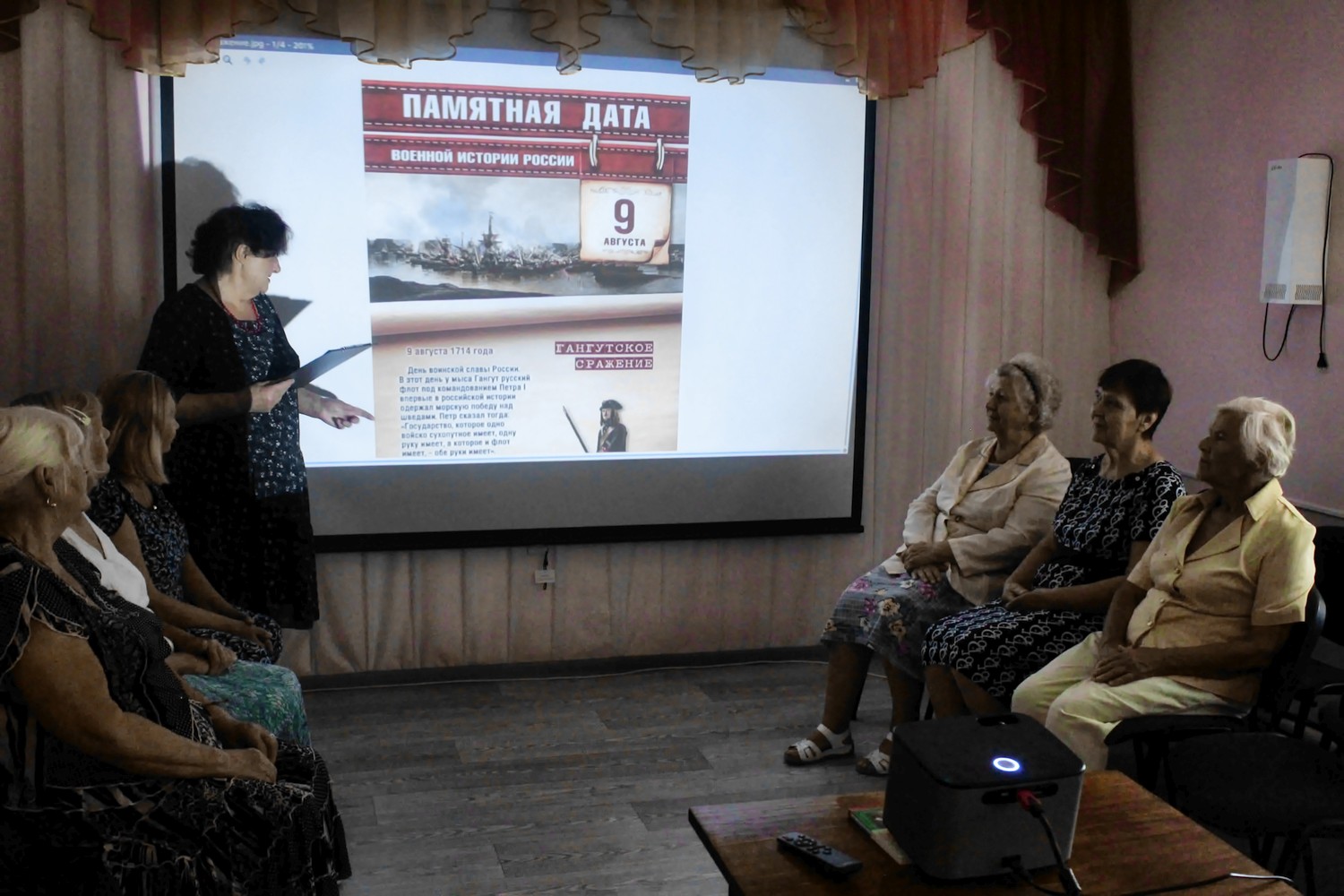 9 августа 2023 года в рамках проекта «Старшее поколение», в отделении дневного пребывания граждан пожилого возраста и инвалидов ГБУ РК «ЦСО Раздольненского района» прошел час истории для получателей социальных услуг, посвященный Дню воинской славы России —дню победы русского флота над шведами в Гангутском сражении (1714 г.).