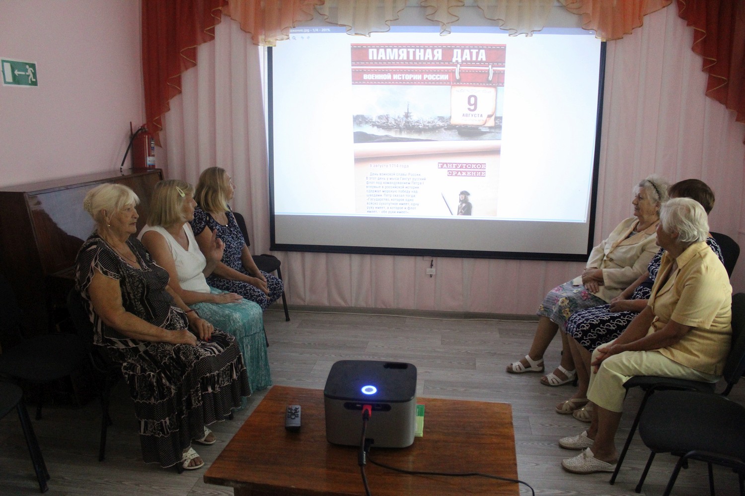 Культорганизатор Лидия Пацак рассказала получателям социальных услуг о ходе сражения, произошедшем 7 августа 1714 года у мыса Гангут в Балтийском море и о тех исторических последствиях, которые повлекла за собой победа русского флота в этой битве. Получателям социальных услуг были показаны видеоролики, рассказывающие о данном историческом событии.
