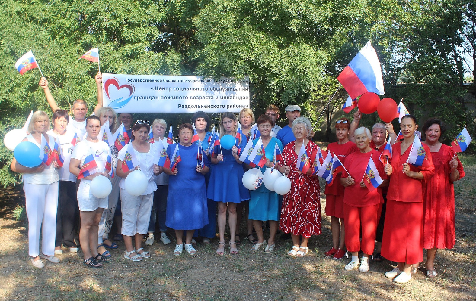 В Государственном бюджетном учреждении Республики Крым «Центр социального обслуживания граждан пожилого возраста и инвалидов Раздольненского района» прошел флешмоб, посвященный Дню Государственного флага Российской Федерации. В мероприятии приняли участие сотрудники Учреждения, получатели социальных услуг и серебряные волонтеры.