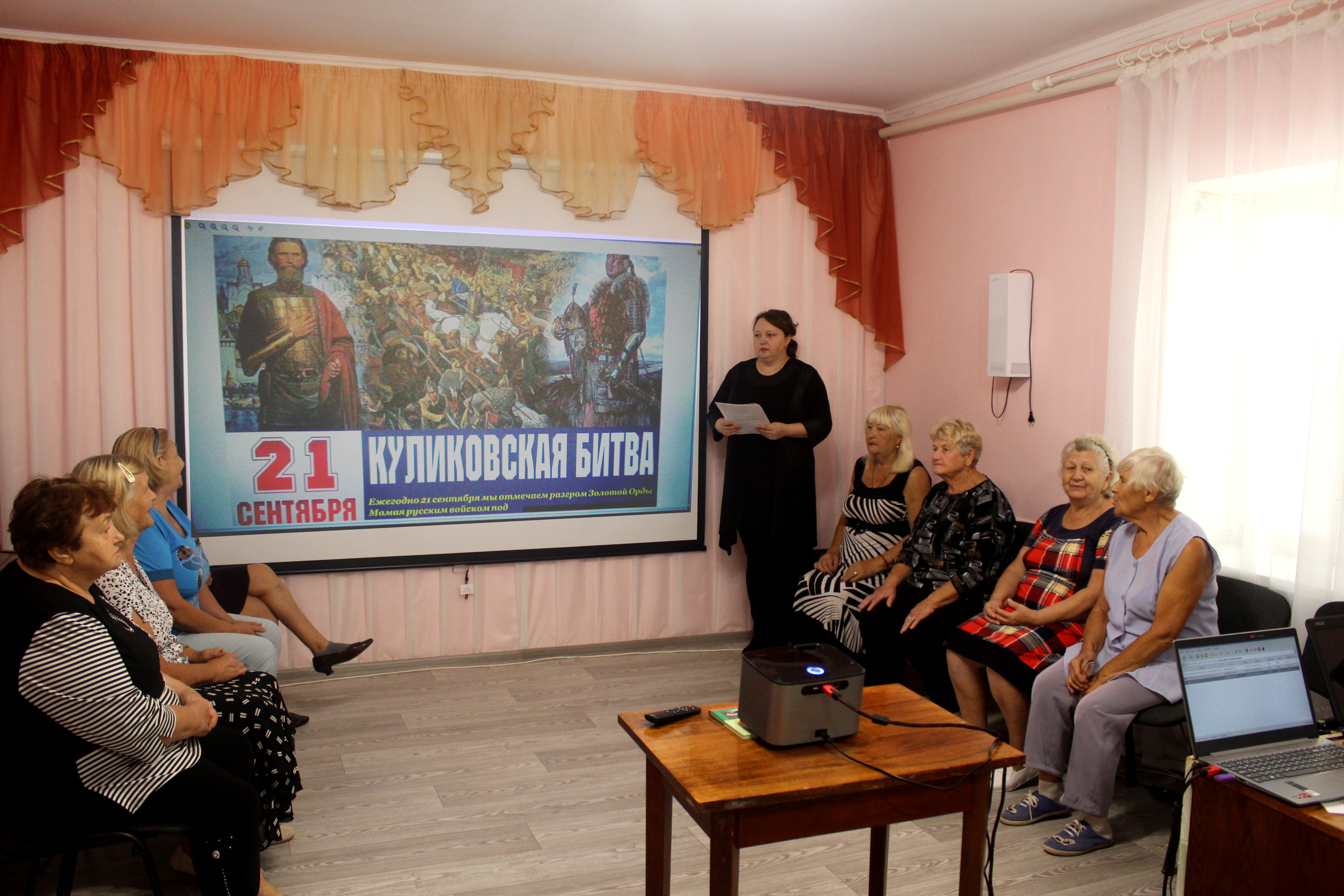 Культорганизатор Ольга Тюнегова рассказала получателям социальных услуг о ходе битвы русских полков во главе с великим князем московским Дмитрием и ордынским войском под началом хана Мамая 8 сентября 1380 на Куликовом поле и о значении результатов этого сражения для дальнейшего хода русской истории.