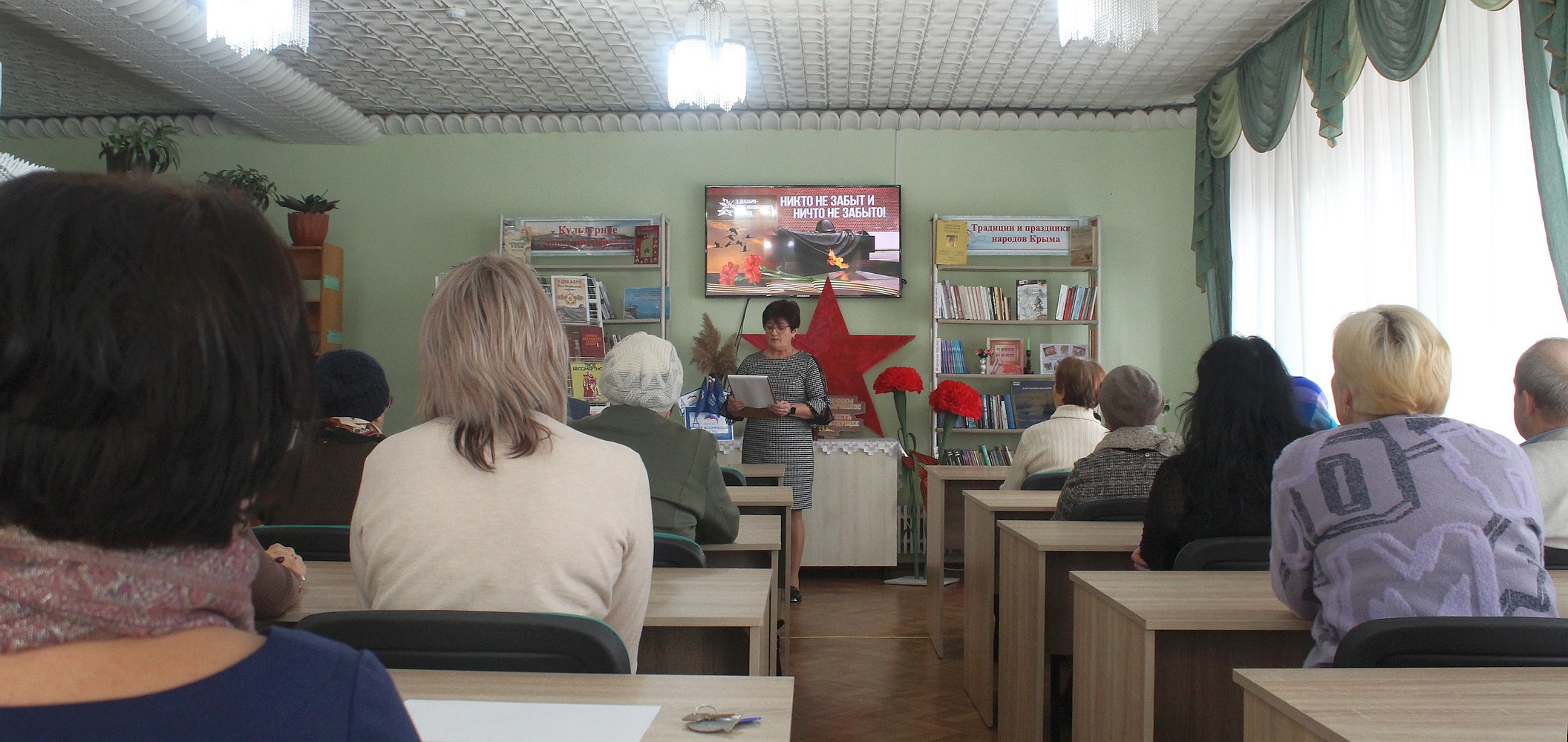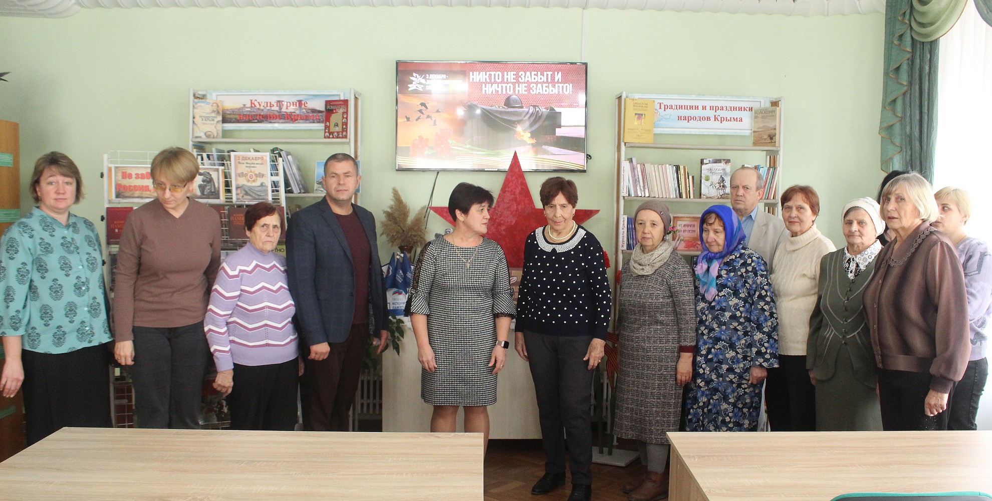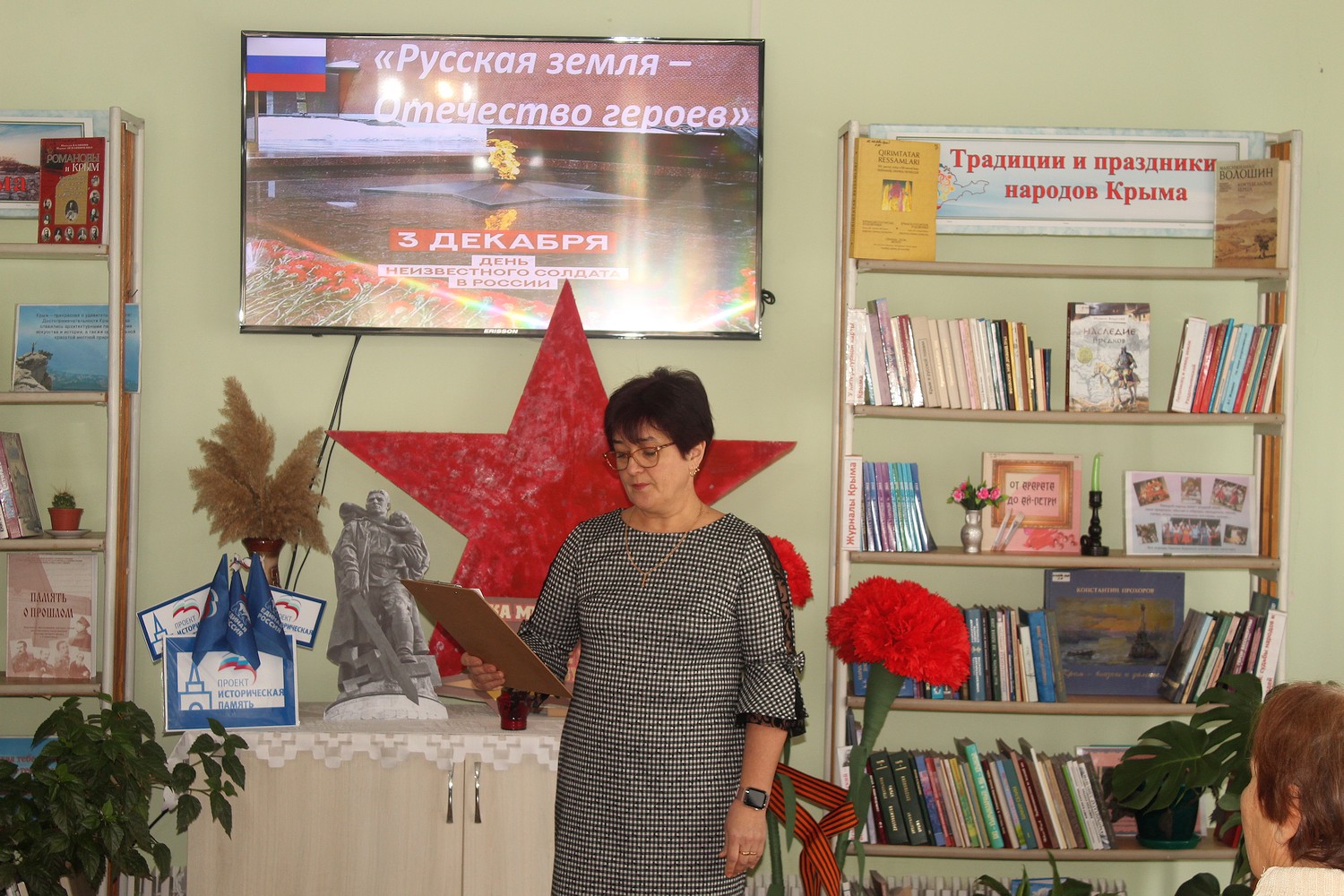 В преддверии Дня Неизвестного Солдата, 1 декабря 2023 года, получатели социальных услуг отделения дневного пребывания ГБУ РК «ЦСО Раздольненского района» посетили мероприятие «Русская земля – Отечество героев», которое проходило в читальном зале Раздольненской центральной районной библиотеки им. А.И. Домбровского.