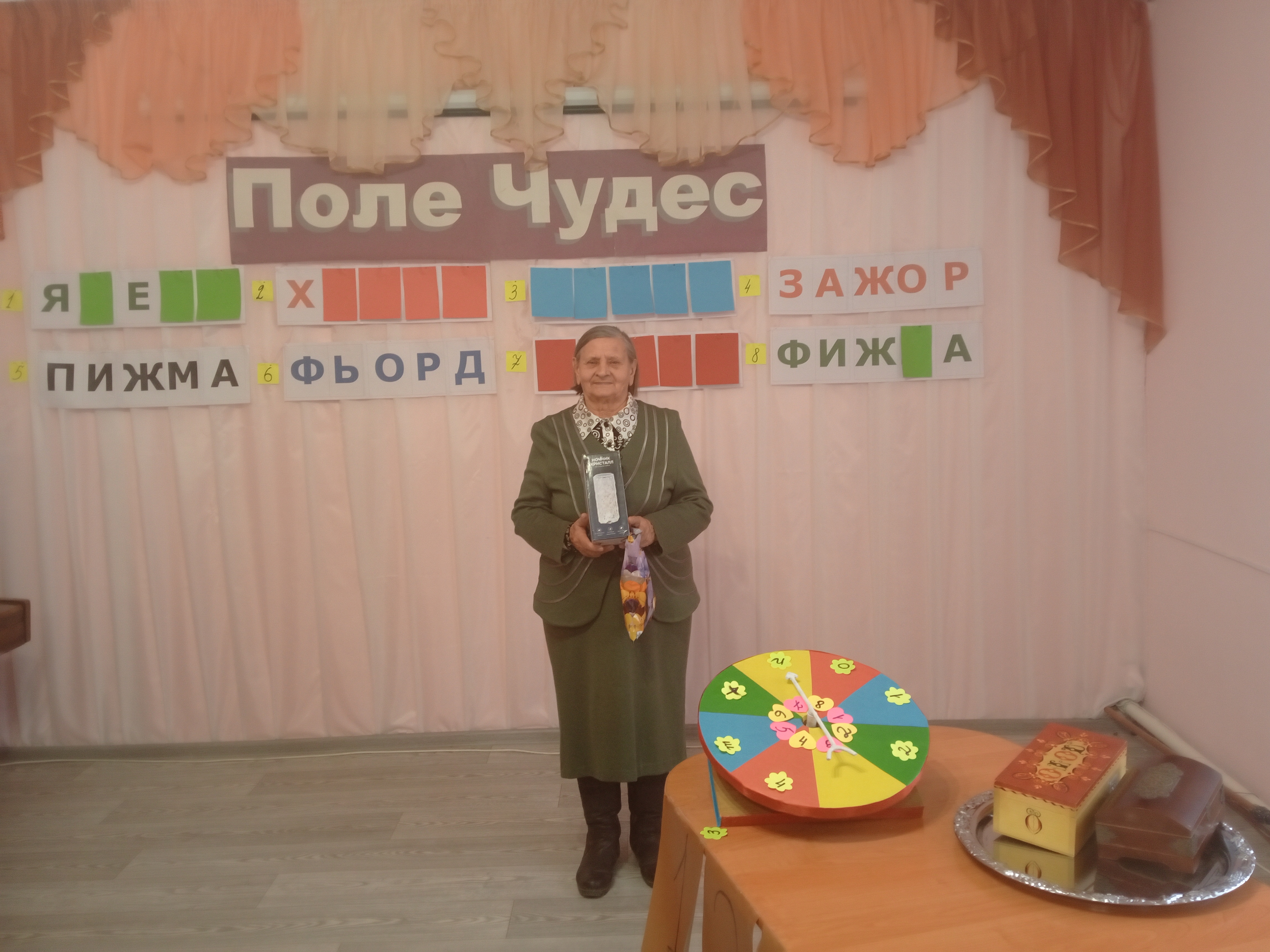 В финал игры вышли Лена Казанцева, Таисия Мищук, Нина Гливанская, Тамара Вишневская, Анна Шумивода. Зрители по-настоящему переживали за финалистов, пытались подсказывать, ответить на непростые задания. Победителем игры стала Гливанская Нина Савельевна. Зрители бурными аплодисментами поздравили Нину Савельевну с победой, а организаторы «Поля чудес» вручили ей приз победителя. ![]()