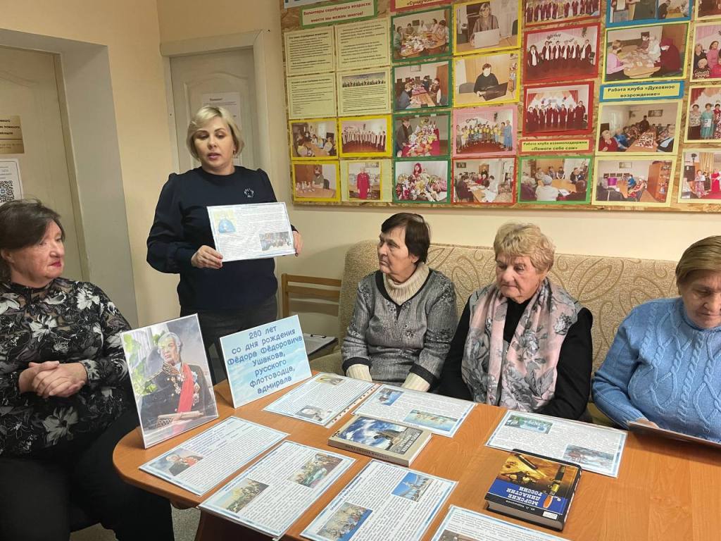 В ходе мероприятия получателям социальных услуг рассказали о жизни, подвигах и достижениях адмирала, о его участии в создании Черноморского флота и разработке уникальной тактики морского боя. Федор Федорович провел 43 морских сражения и не потерпел ни единого поражения. Благодаря его таланту Русско-турецкая война 1787–1791 гг. была выиграна, а сам Ушаков вошел в историю как непобедимый адмирал. А также, о борьбе с эпидемией чумы в Херсоне, о крупных военно-морских сражениях и подвигах, прославивших флотоводца далеко за пределами родины.