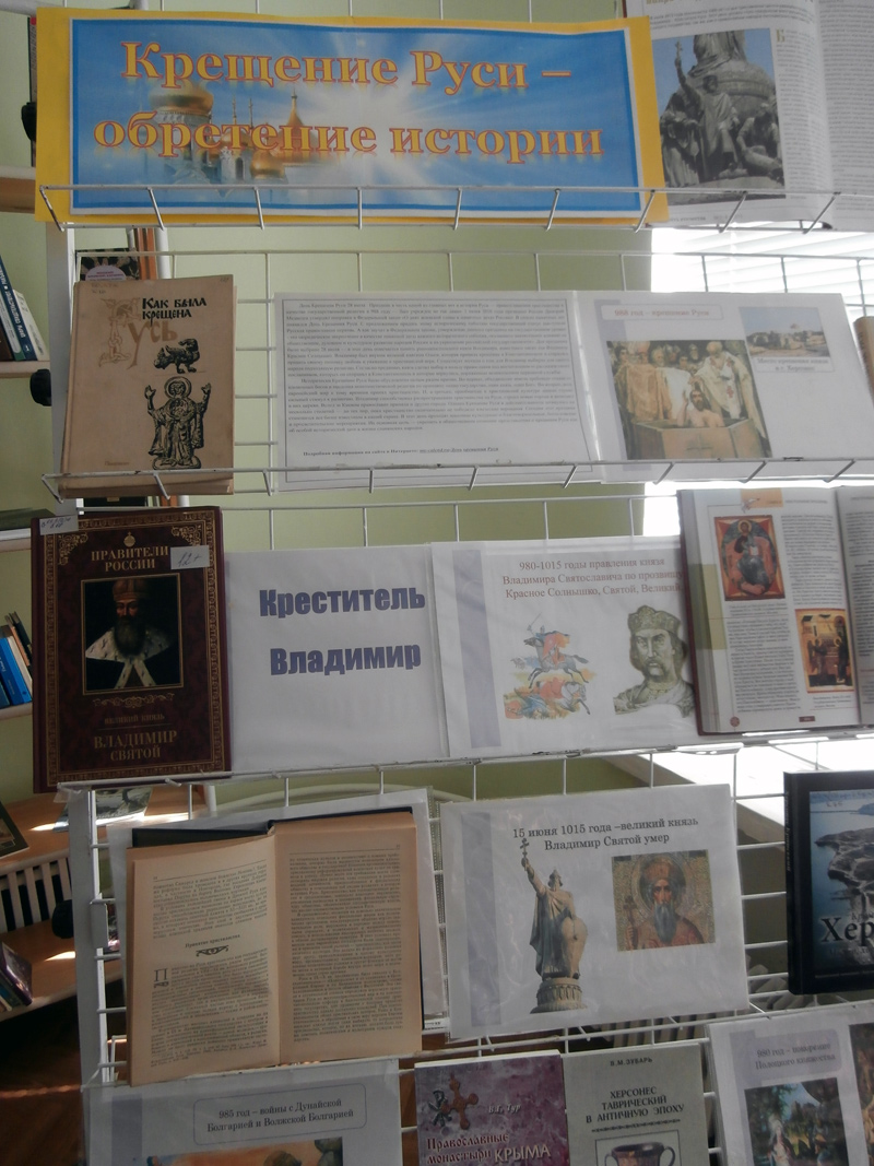 Вниманию получателей социальных услуг отделения дневного пребывания граждан пожилого возраста и инвалидов ГБУ РК "ЦСО Раздольненского района" были представлены книжные выставки "Крещение Руси - обретение истории" и "Православная энциклопедия".