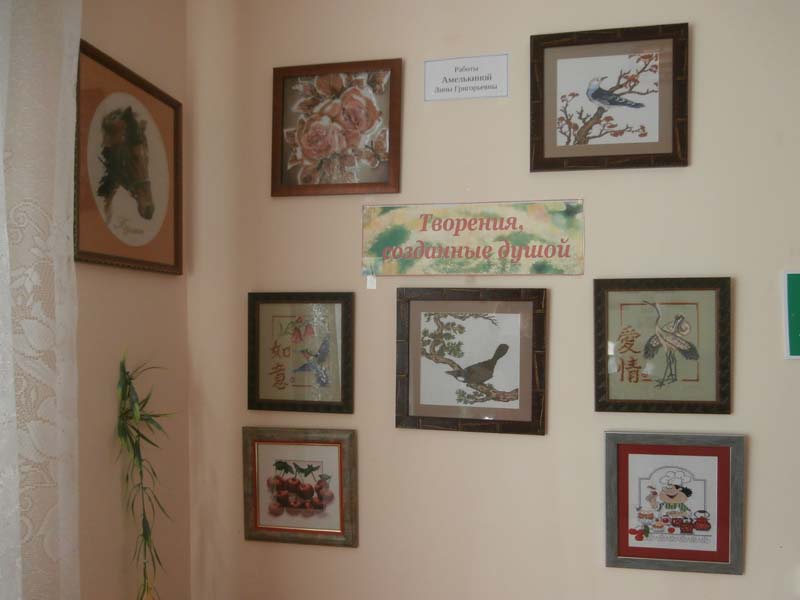 В отделении дневного пребывания граждан пожилого возраста и инвалидов ГБУ РК «ЦСО Раздольненского района» к Международному женскому дню 8 Марта оформлена выставка вышитых картин «Творения, созданные душой» получателя социальных услуг Амелькиной Лины Григорьевны.