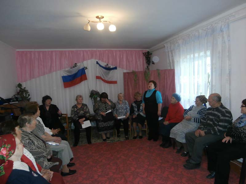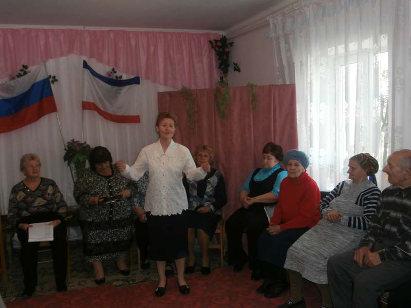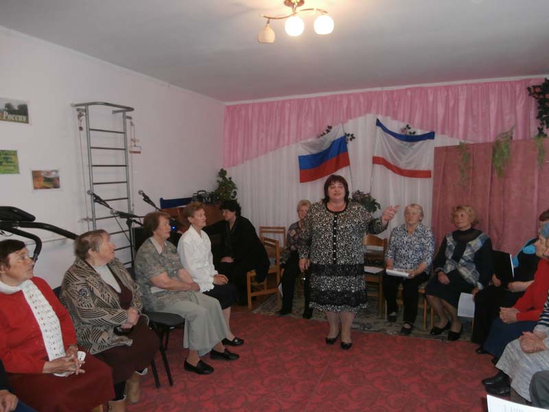 Культорганизатор Раиса Галимская начала праздничное мероприятие с поздравления присутствующих получателей социальных услуг с третьей годовщиной принятия Конституции в Республике Крым