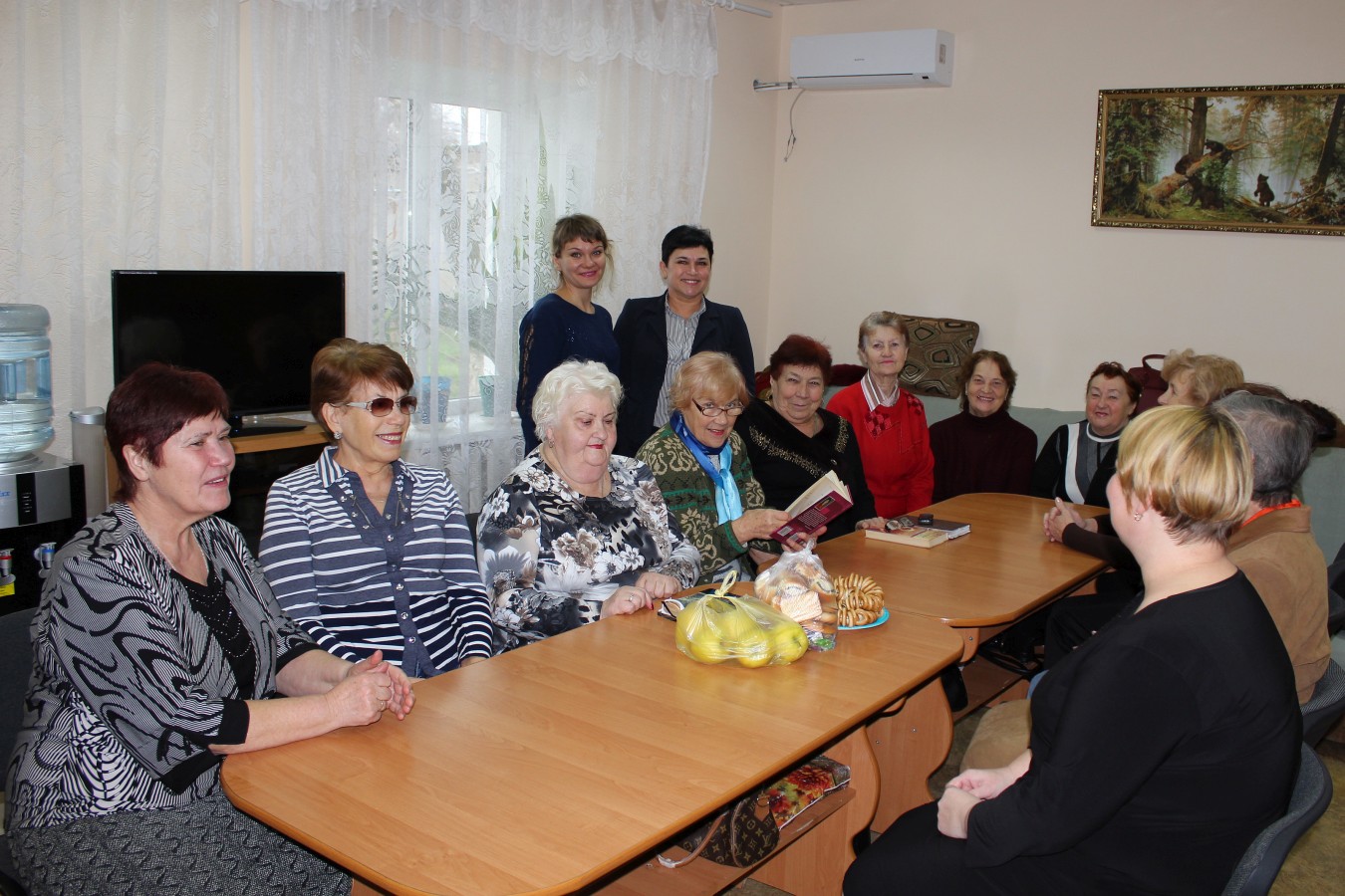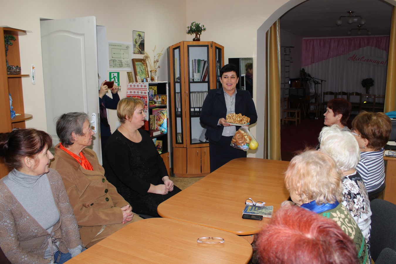 Сотрудники ЗАГС рассказали получателям социальных услуг об истории появления Международного дня спонтанного проявления доброты и о том, как отмечают этот день в разных странах. Валентина и Неля поздравили присутствующих с проходящей на этой неделе масленицей, и преподнесли получателям социальных услуг угощения — сладости к чаю.