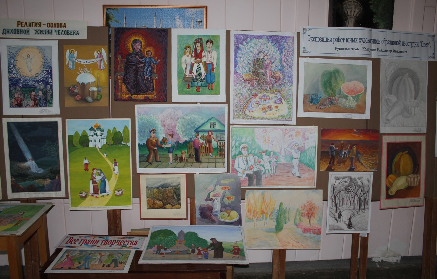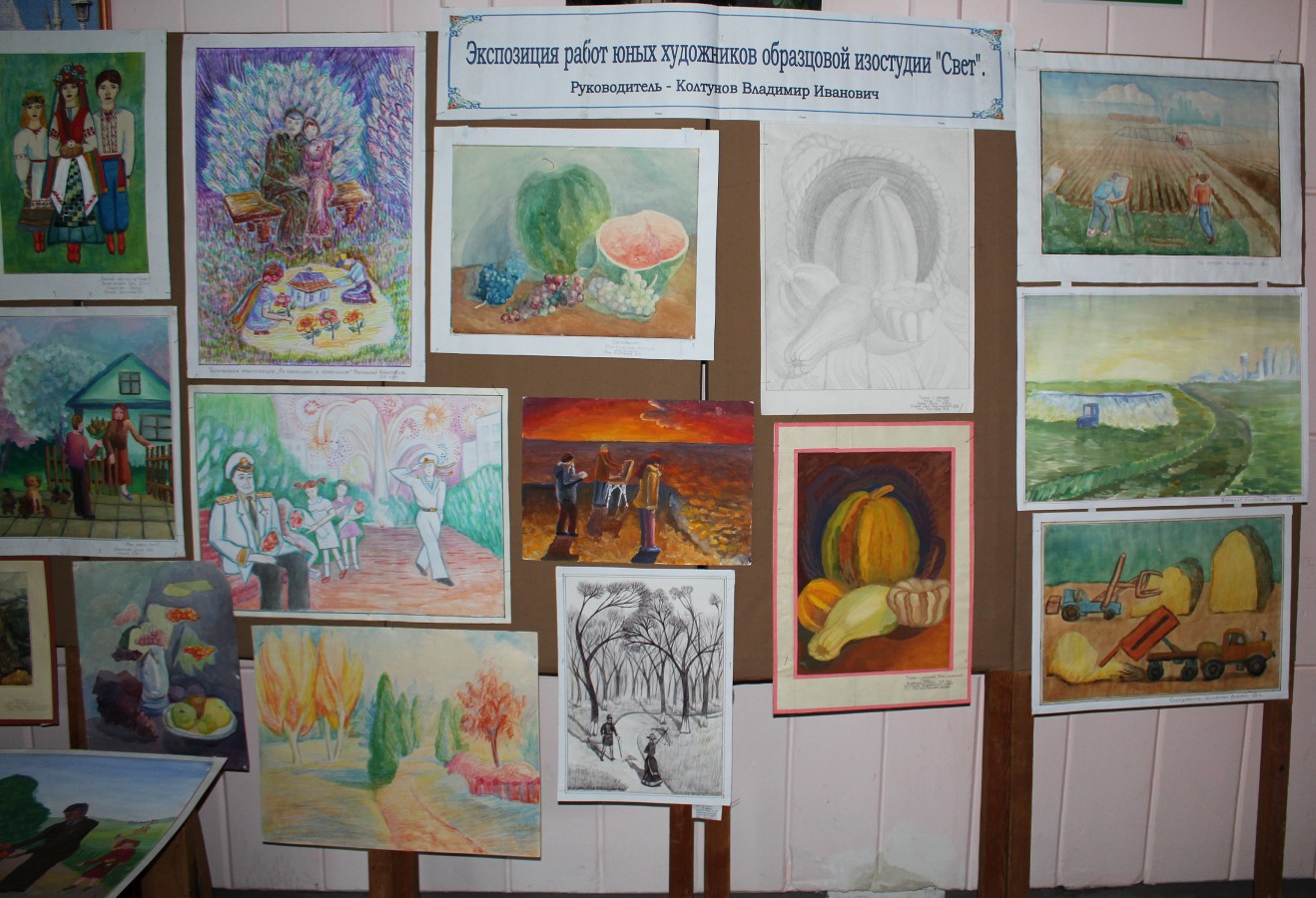 В фойе Дома культуры была представлена экспозиция работ воспитанников образцовой изостудии «Свет», которой в течение многих лет руководил Владимир Иванович. Разнообразие этих работ просто поражает воображение: библейские сюжеты, иллюстрации к детским книгам, пейзажи, натюрморты, портреты выдающихся раздольненцев и прочее, прочее, прочее...