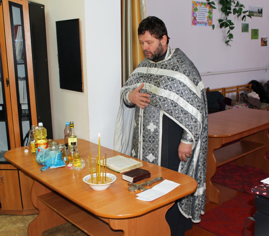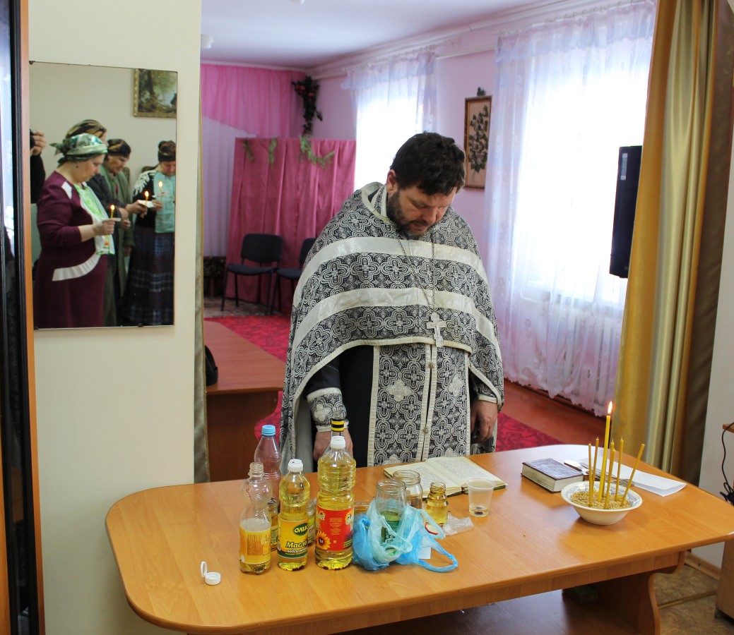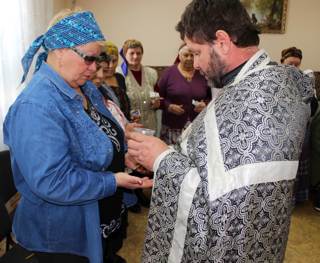 В те дни, когда Центр социального обслуживания посещает отец Олег, в отделении дневного пребывания бывает особенно многолюдно. В этот раз священник совершил Таинство Соборования, по-другому именуемое Елеосвящение.