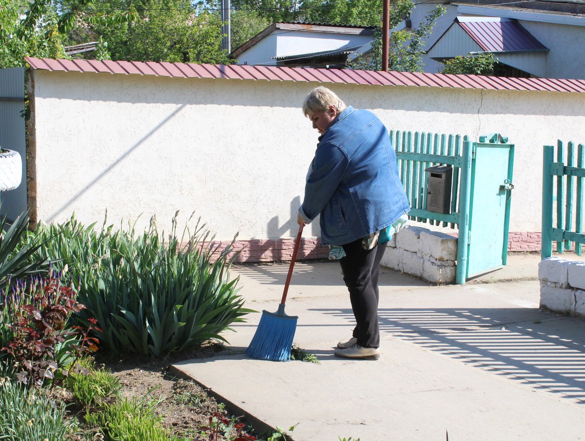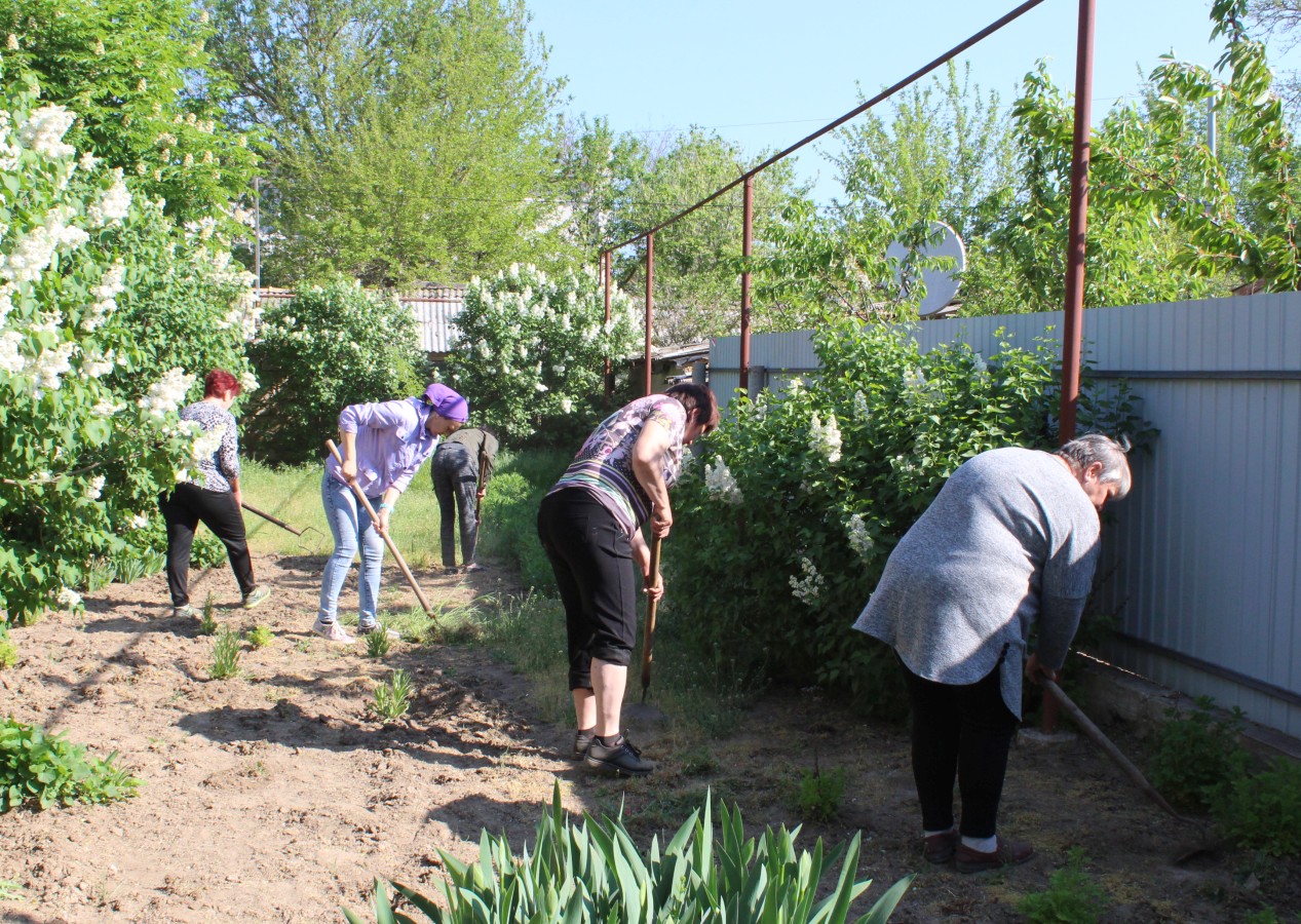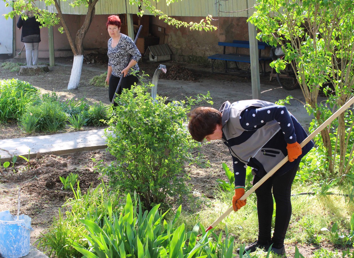 Сотрудники администрации учреждения и социальные работники совместными усилиями подготовили Центр социального обслуживания и прилегающую территорию к майским праздникам — очистили клумбы от прошлогодней листвы, пропололи траву, убрали тротуары и пешеходные дорожки.