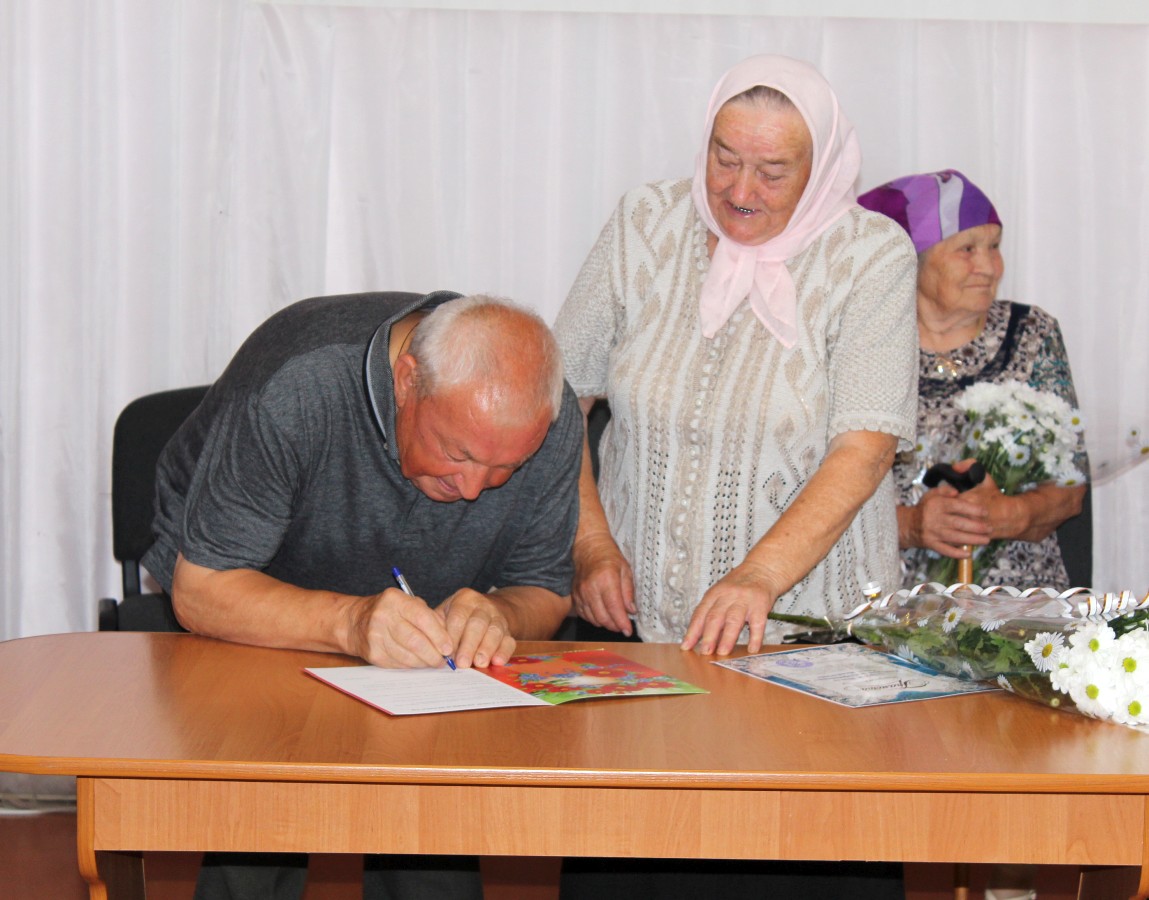 В завершение праздника сотрудник ЗАГС Валентина Костюкова преподнесла почетным гостям интересный сюрприз: прочитала и предложила подписать почетные документы — «клятву верности мужа» и «клятву верности жены». Обе супружеские пары сделали это с превеликим удовольствием.