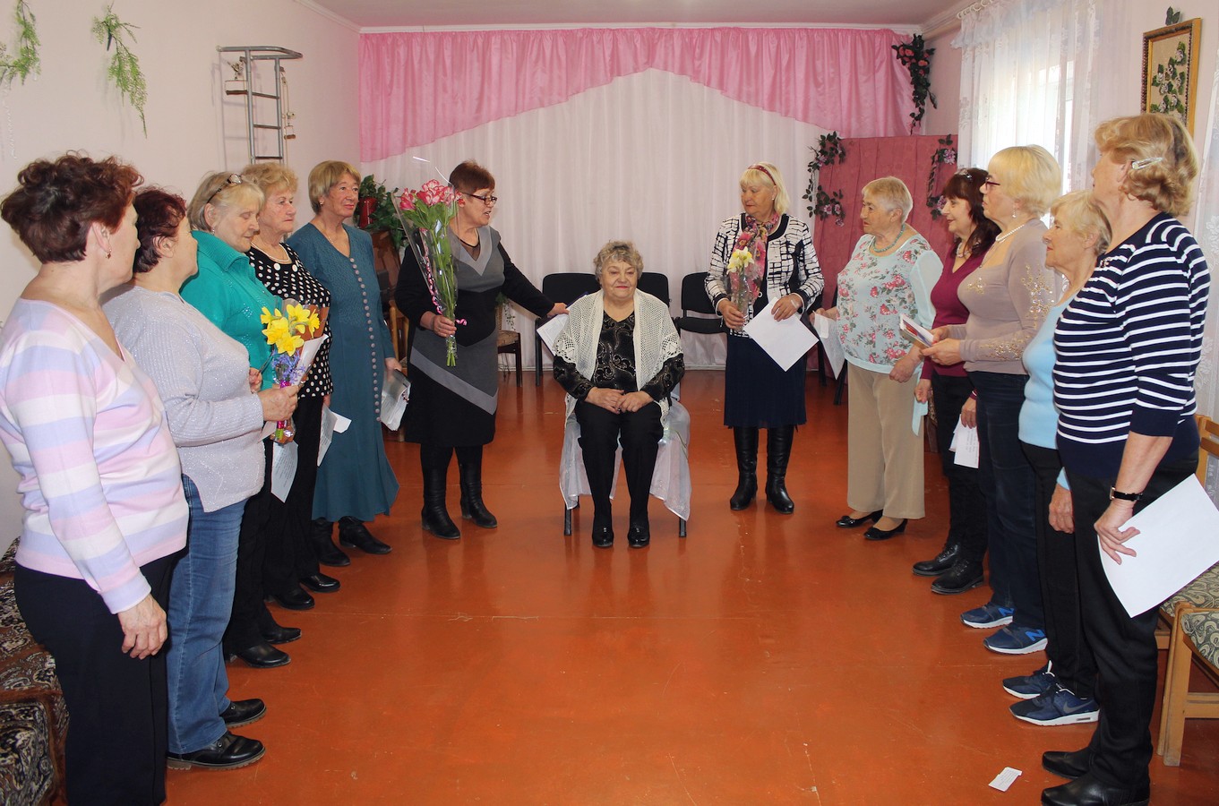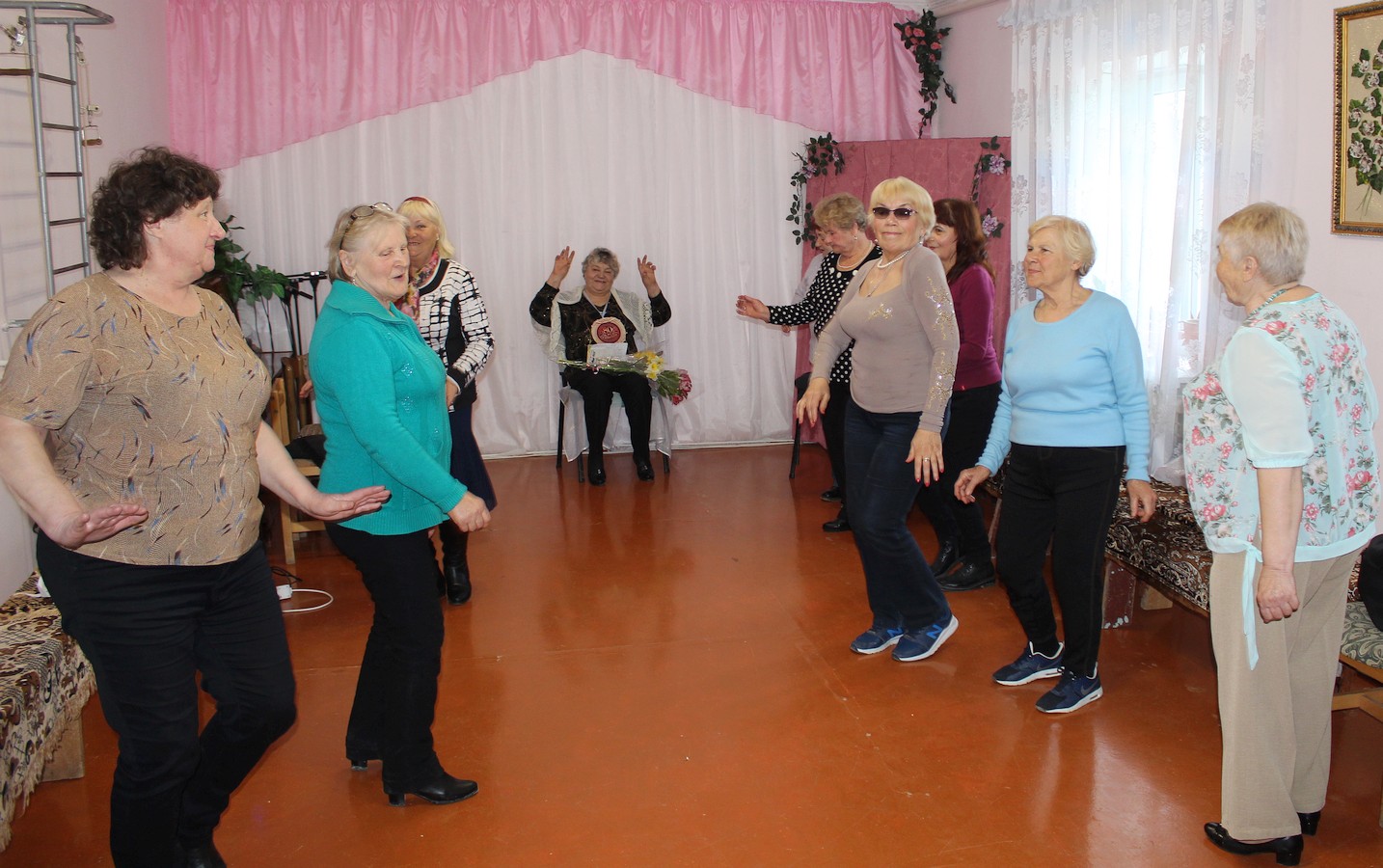 Серебряные волонтеры — участники вокального ансамбля «Беспокойные сердца» — подготовили для именинницы веселый музыкальный сценарий с песнями, забавными играми, шуточным хороводом и, конечно же, множеством поздравлений и добрых пожеланий.