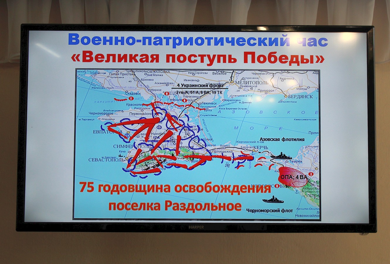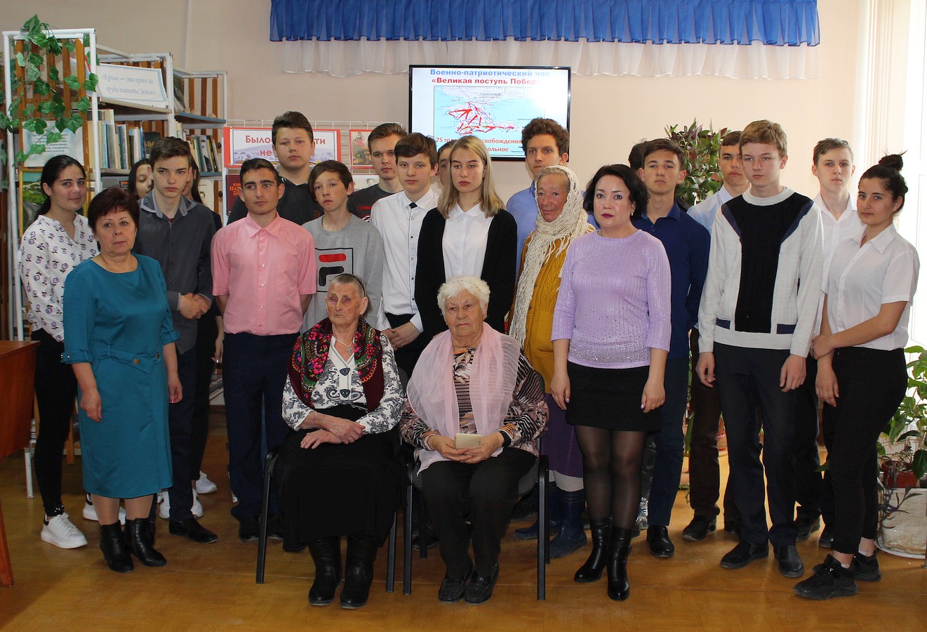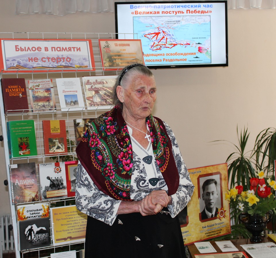 Библиотекари Галина Новикова и Ленара Сейт-Билял представили краткую историческую справку о событиях, которые разворачивались в нашем районе во время Великой Отечественной войны: о действиях подпольщиков в период оккупации, о героических подвигах и трагической судьбе семьи Ким, о наступлении советских войск и освобождении поселка Ак-Шейх в апреле 1944 года.