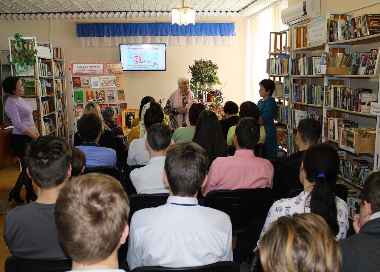12 апреля 2019 года получатели социальных услуг ГБУ РК «ЦСО Раздольненского района» приняли участие в проведении военно-патриотического часа «Великая поступь Победы», который проходил в читальном зале Раздольненской центральной районной библиотеки им. А.И. Домбровского и был приурочен к 75-ой годовщине освобождения поселка Раздольное и Раздольненского района от немецко-фашистских захватчиков. На этом мероприятии также присутствовали читатели библиотеки и учащиеся 10 класса МБОУ «Раздольненская школа-гимназия №2» им. Л. Рябики.