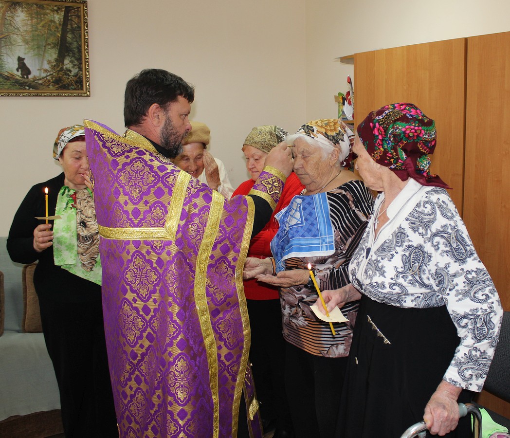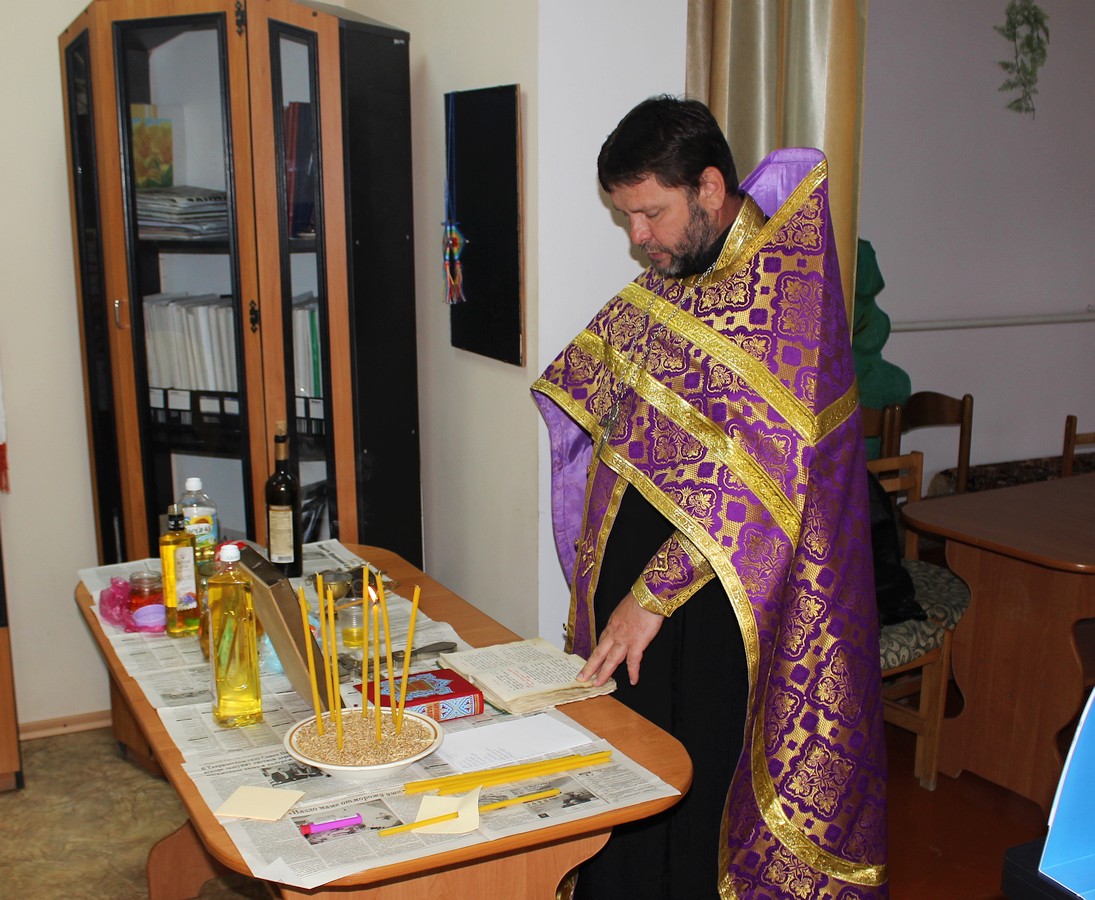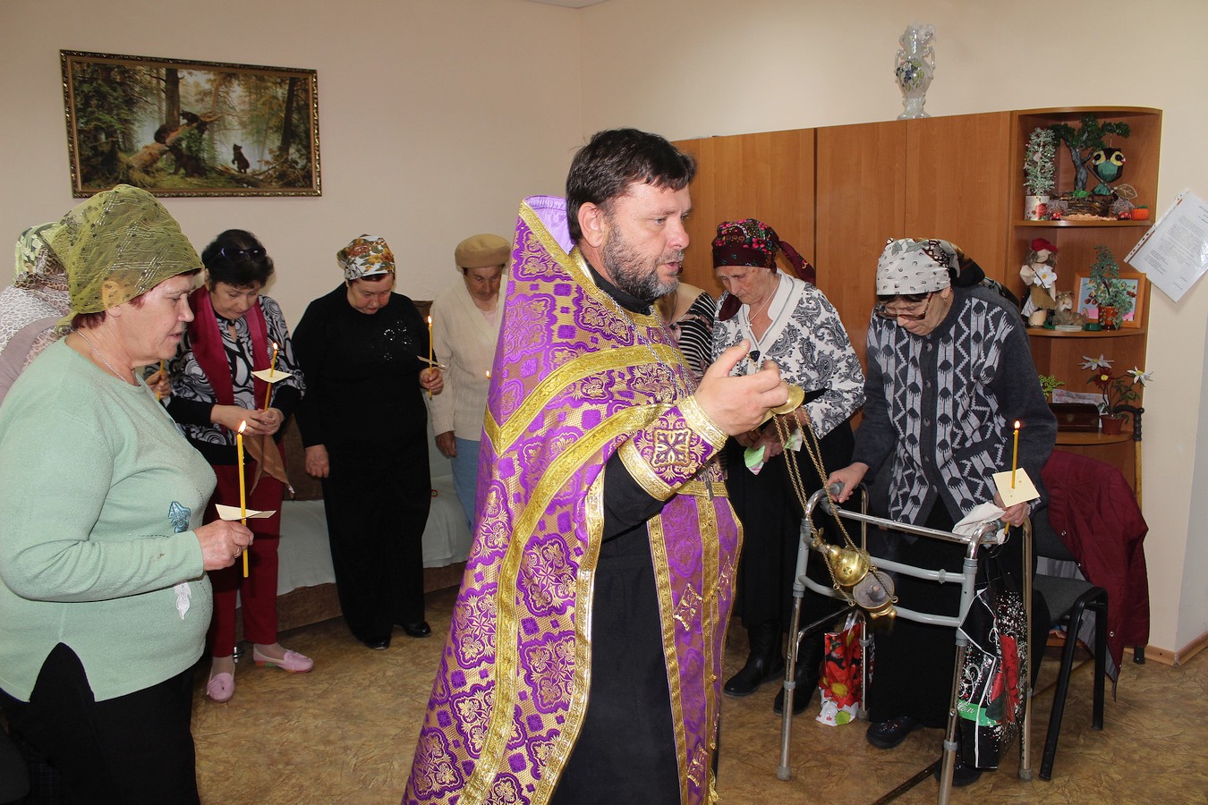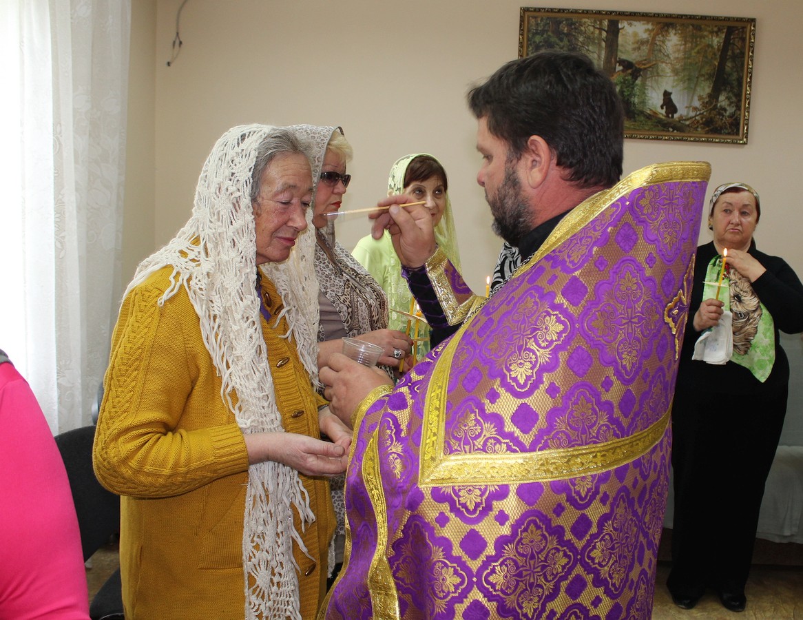 В те дни, когда Центр социального обслуживания посещает отец Олег, в отделении дневного пребывания всегда бывает многолюдно. В этот раз священник совершил Таинство Соборования, по-другому именуемое Елеосвящение.