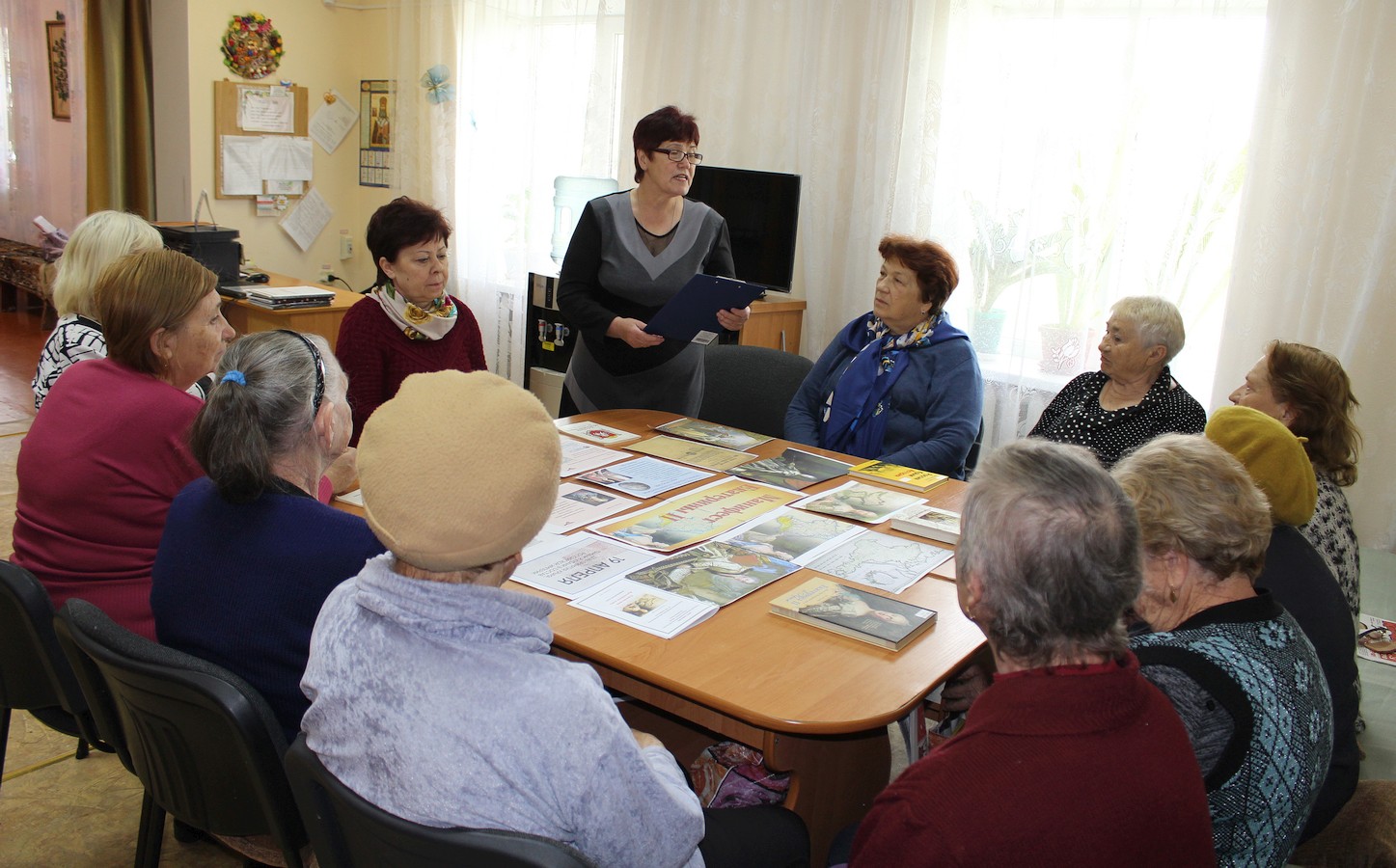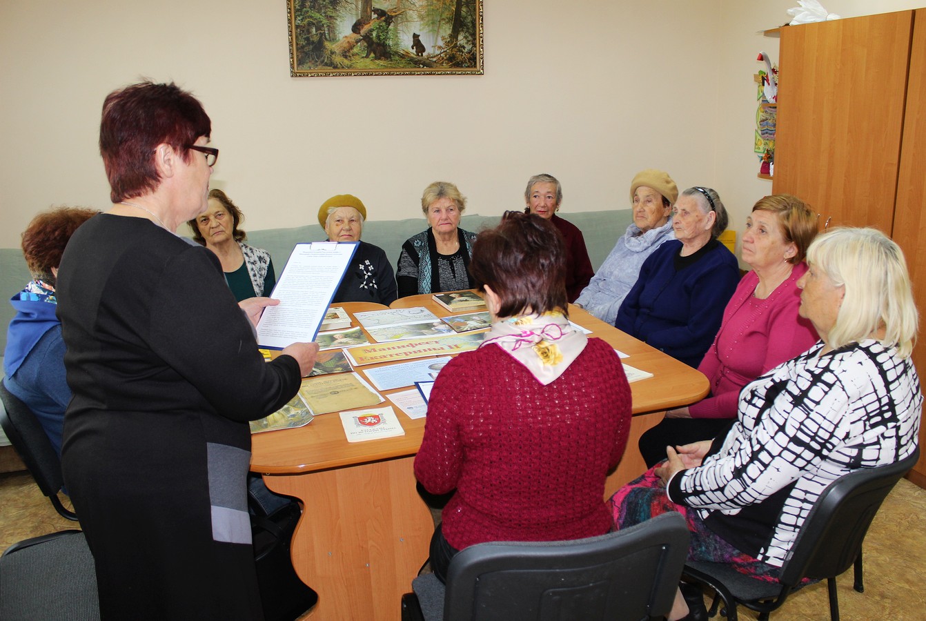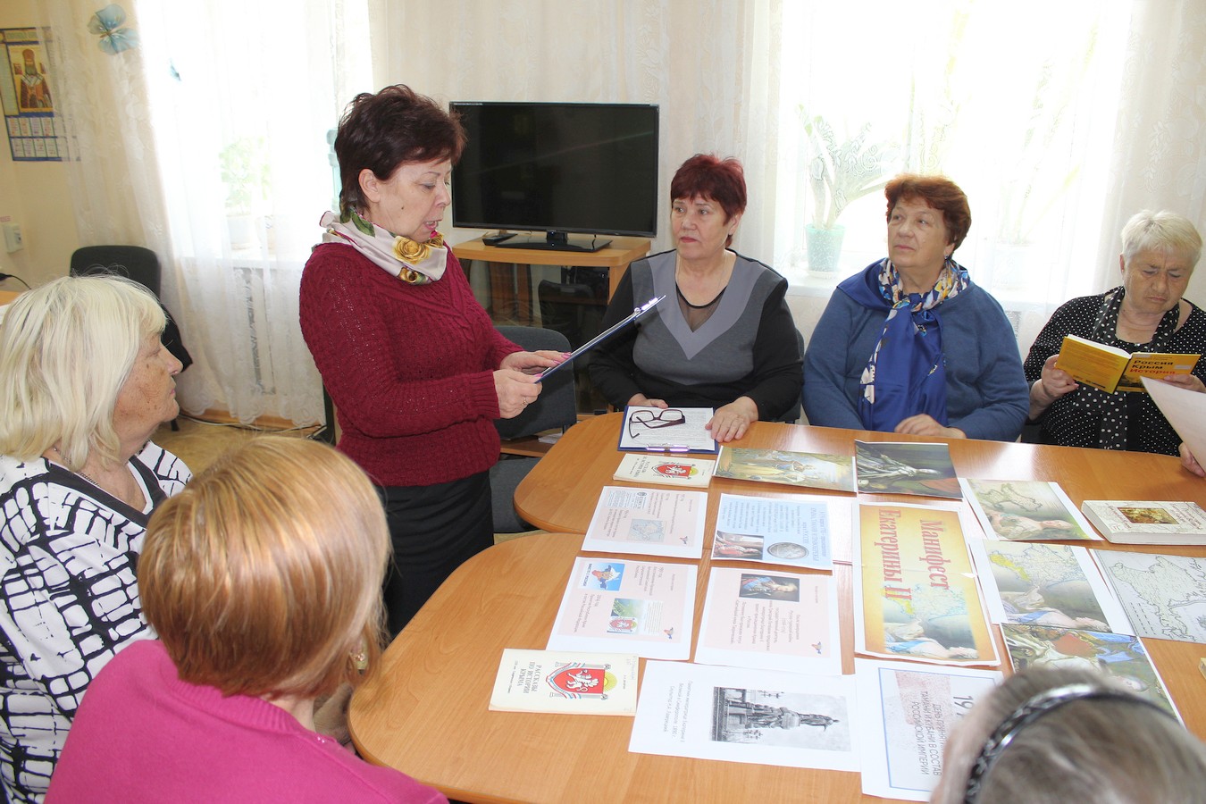 Культорганизатор отделения дневного пребывания Раиса Галимская рассказала получателям социальных услуг об исторических событиях, которые предшествовали изданию Манифеста, о геополитической обстановке на полуострове на момент подписания Манифеста и об изменениях в Крыму, которые последовали после присоединения полуострова к России в конце XVIII века.