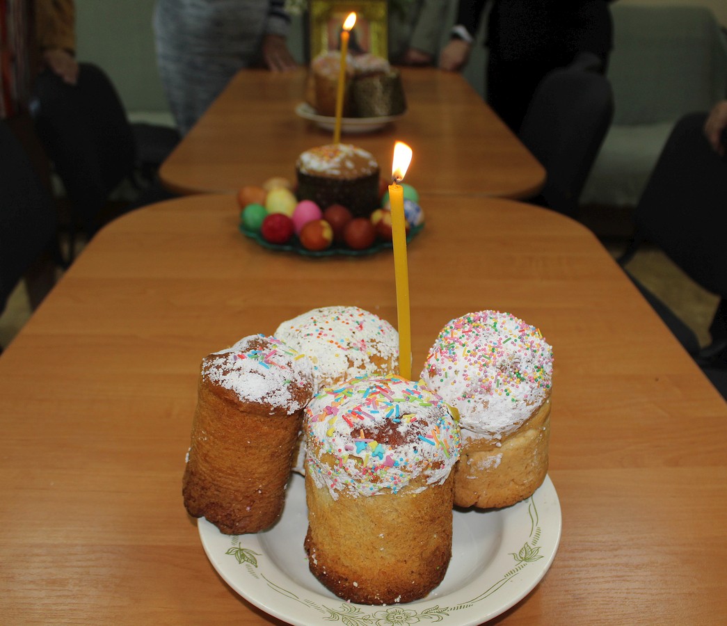 Священник преподнес получателям социальных услуг пасхальные куличи, освященные в церкви.