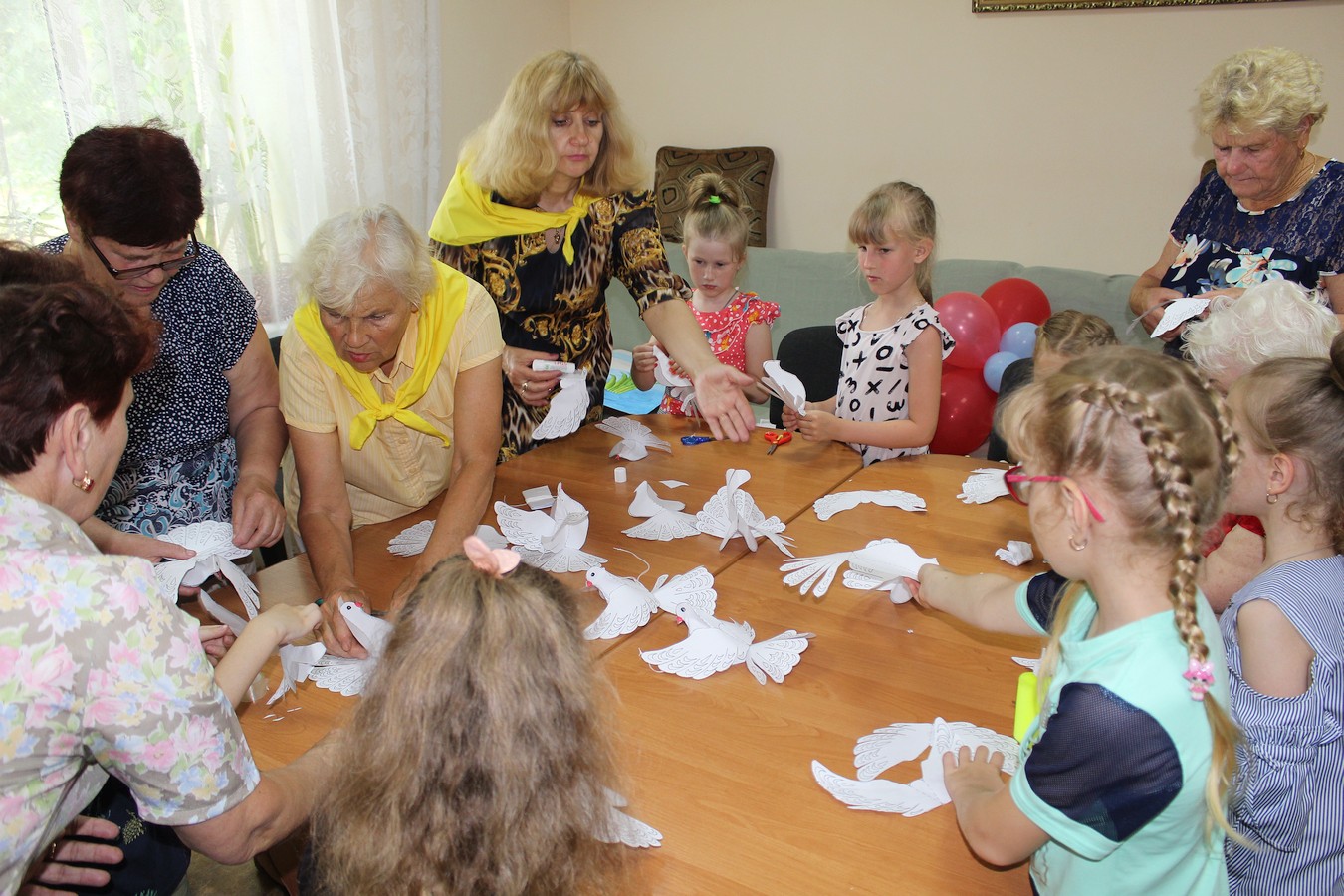 В рамках проведенного мастер-класса дети учились работать с бумагой, ножницами, клеем, красками. Под руководством волонтеров юные мастера оформили стенд «Пусть будет мир на всей земле» и изготовили бумажных голубей. Мальчики и девочки очень старались, но сделать все с первого раза получалось не у каждого...