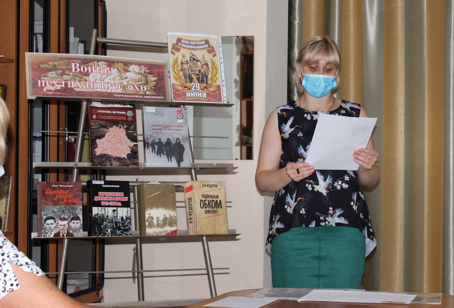 Для присутствующих на мероприятии была подготовлена книжная выставка «Войны неутихающее эхо», на которой была представлена художественная и документальная литература, рассказывающая о наиболее известных представителях партизанского движения, о самоотверженных подвигах, совершенных партизанскими соединениями в ходе войны, о мужестве советского народа.