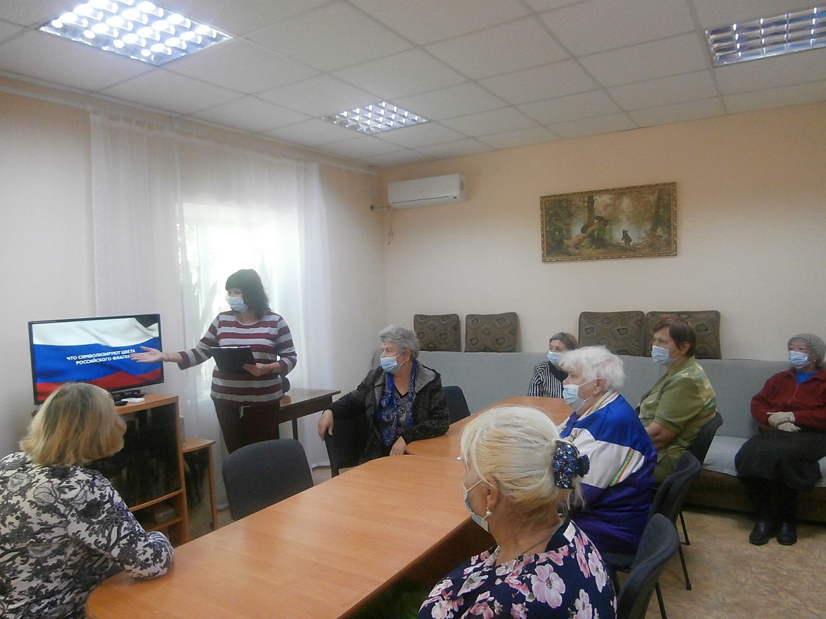 Культорганизатор Ольга Петрив рассказала историю возникновения Государственного герба и флага Республики Крым. Получатели социальных услуг с интересом прослушали историю, посвященному этому событию, и просмотрели видеоролик.