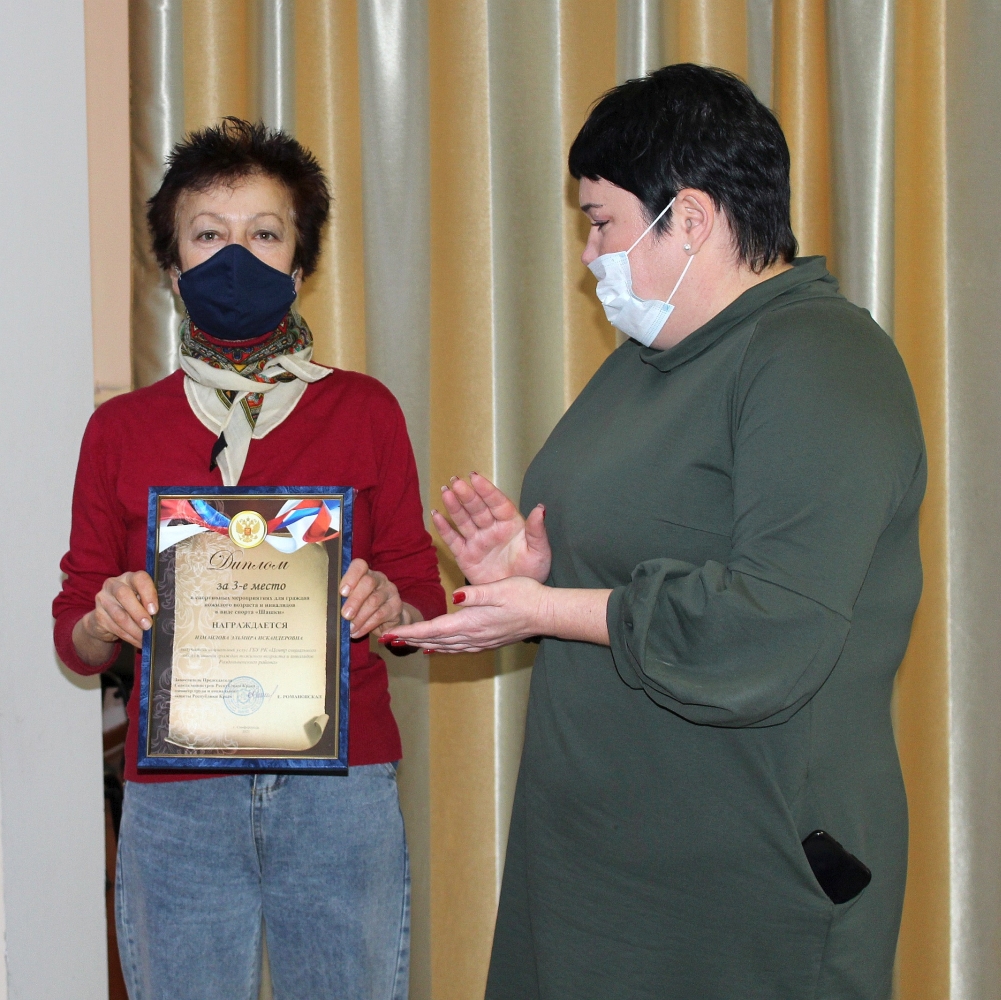 По результатам проведения шахматно - шашечного турнира получатель социальных услуг отделения дневного пребывания граждан пожилого возраста и инвалидов ГБУ РК «ЦСО Раздольненского района» Эльмира Искандеровна Измаилова награждена дипломом за 3-е место в спортивных мероприятиях в виде спорта «Шашки».