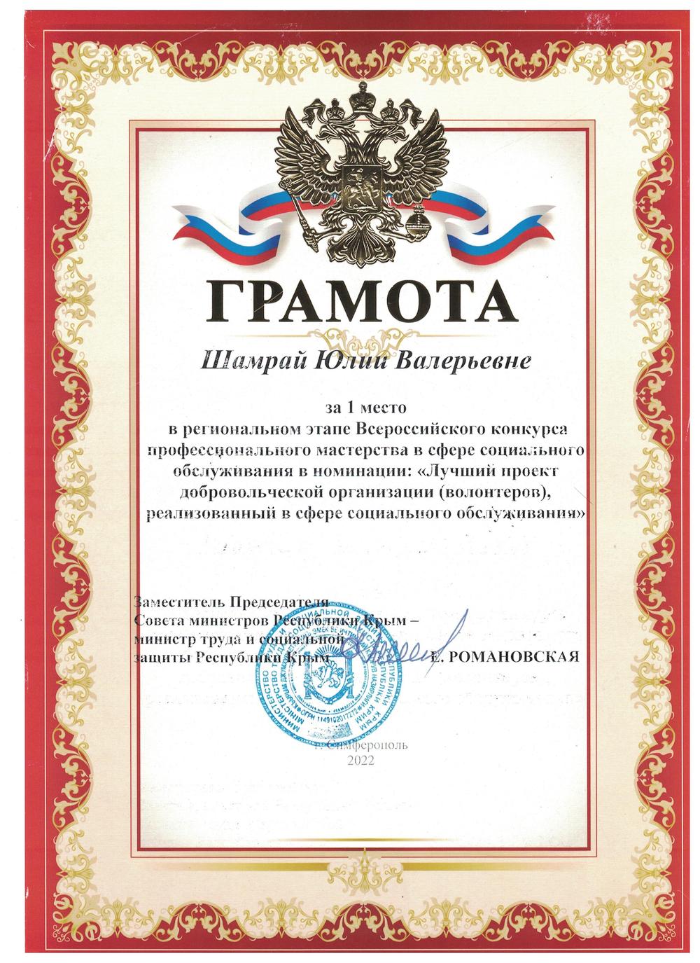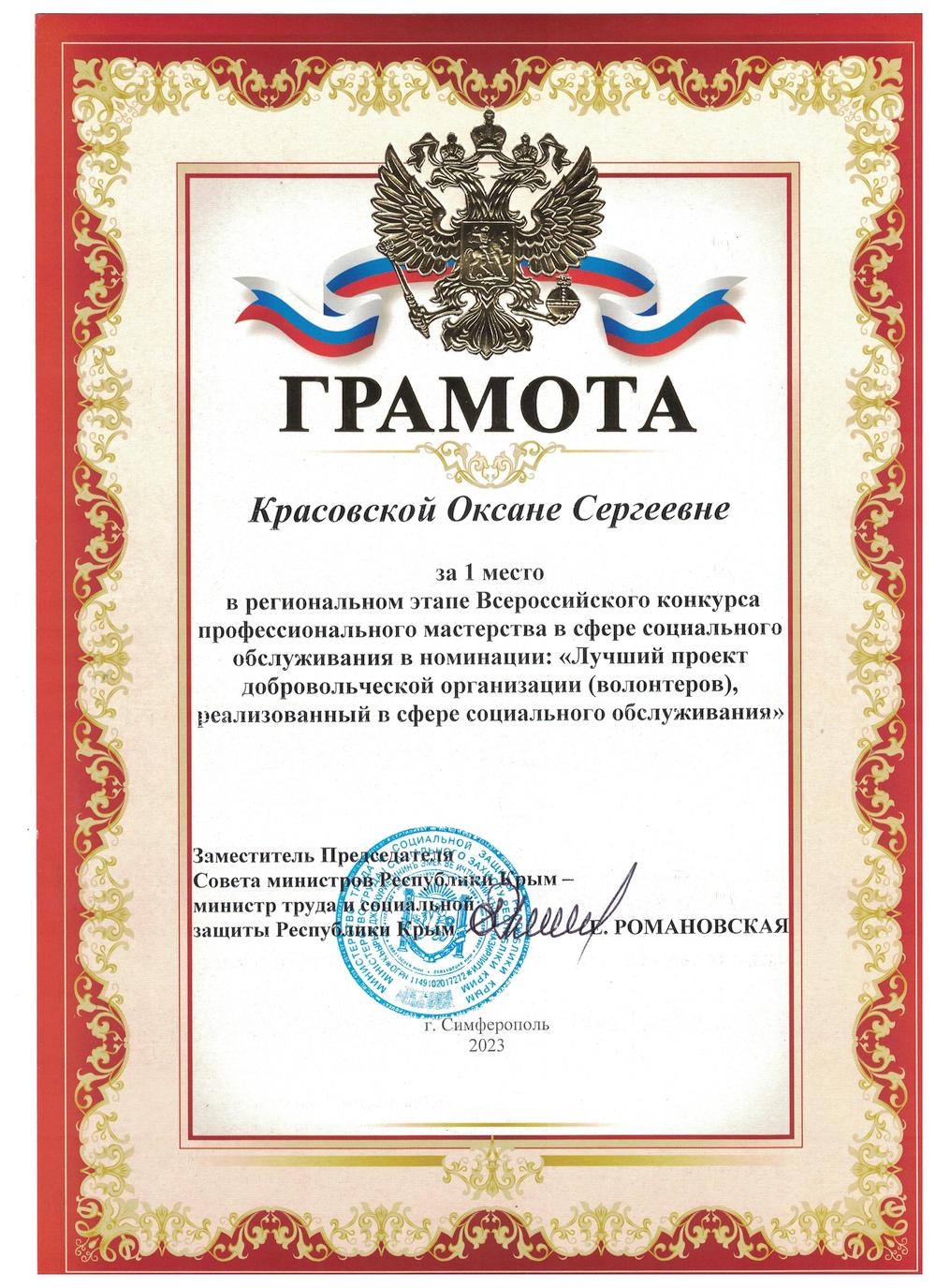 На протяжении двух лет Государственное бюджетное учреждение Республики Крым «Центр социального обслуживания граждан пожилого возраста и инвалидов Раздольненского района» одерживает победу в региональном этапе Всероссийского конкурса профессионального мастерства в сфере социального обслуживания в номинации: «Лучший проект добровольческой организации (волонтеров), реализованный в сфере социального обслуживания».