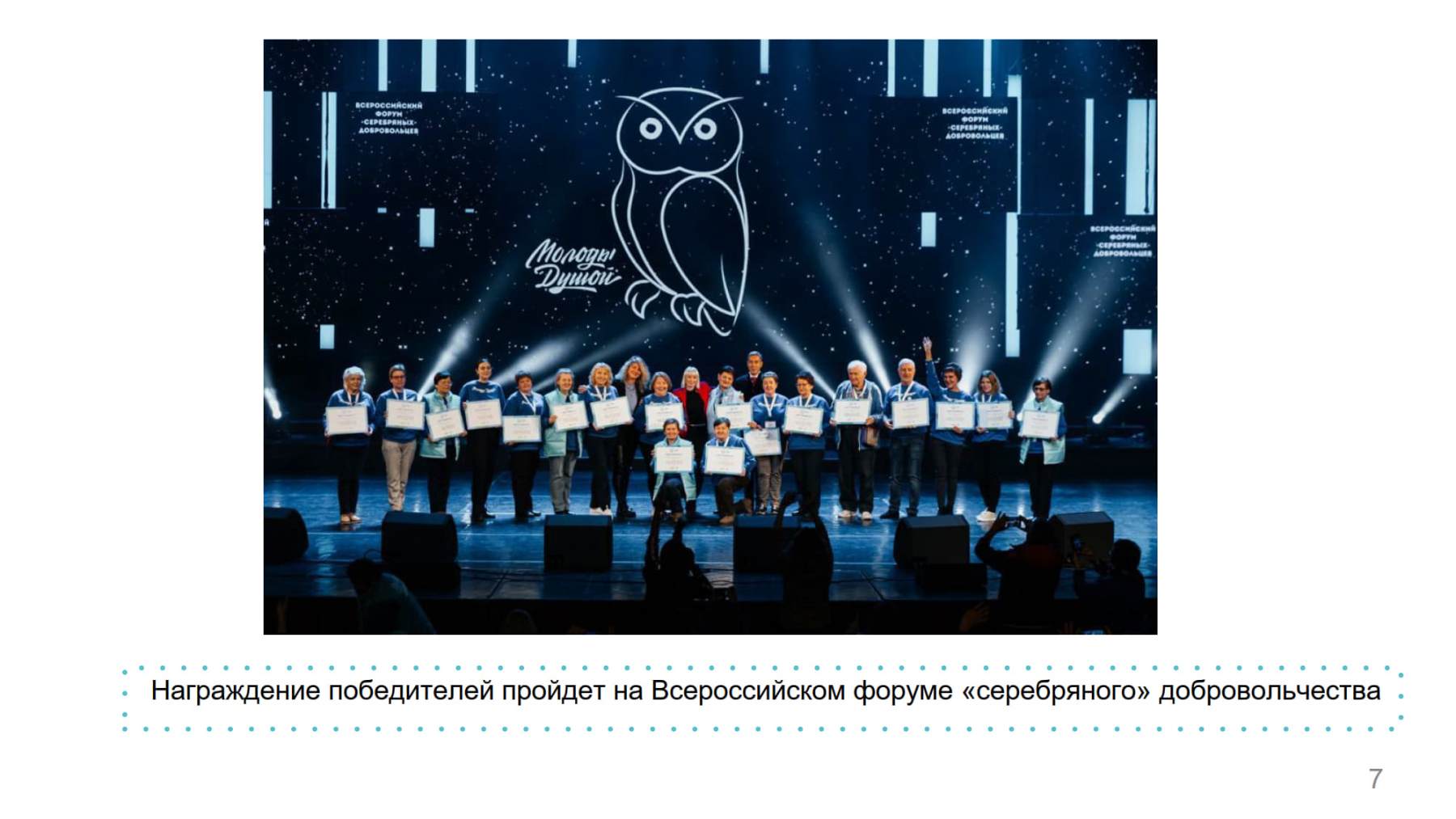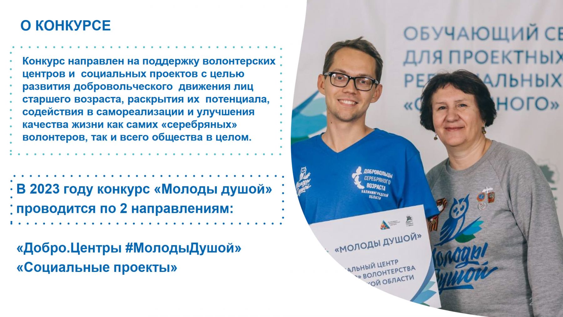 В 2022 году победителями Конкурса стали 19 организаций и 70 проектов, направленных на развитие «серебряного» волонтерства. Конкурс проводится по двум направлениям: Добро.Центры #МолодыДушой и «Социальные проекты», участниками могут стать как некоммерческие организации, так и физические лица. Общий грантовый фонд составляет 40 млн рублей.
