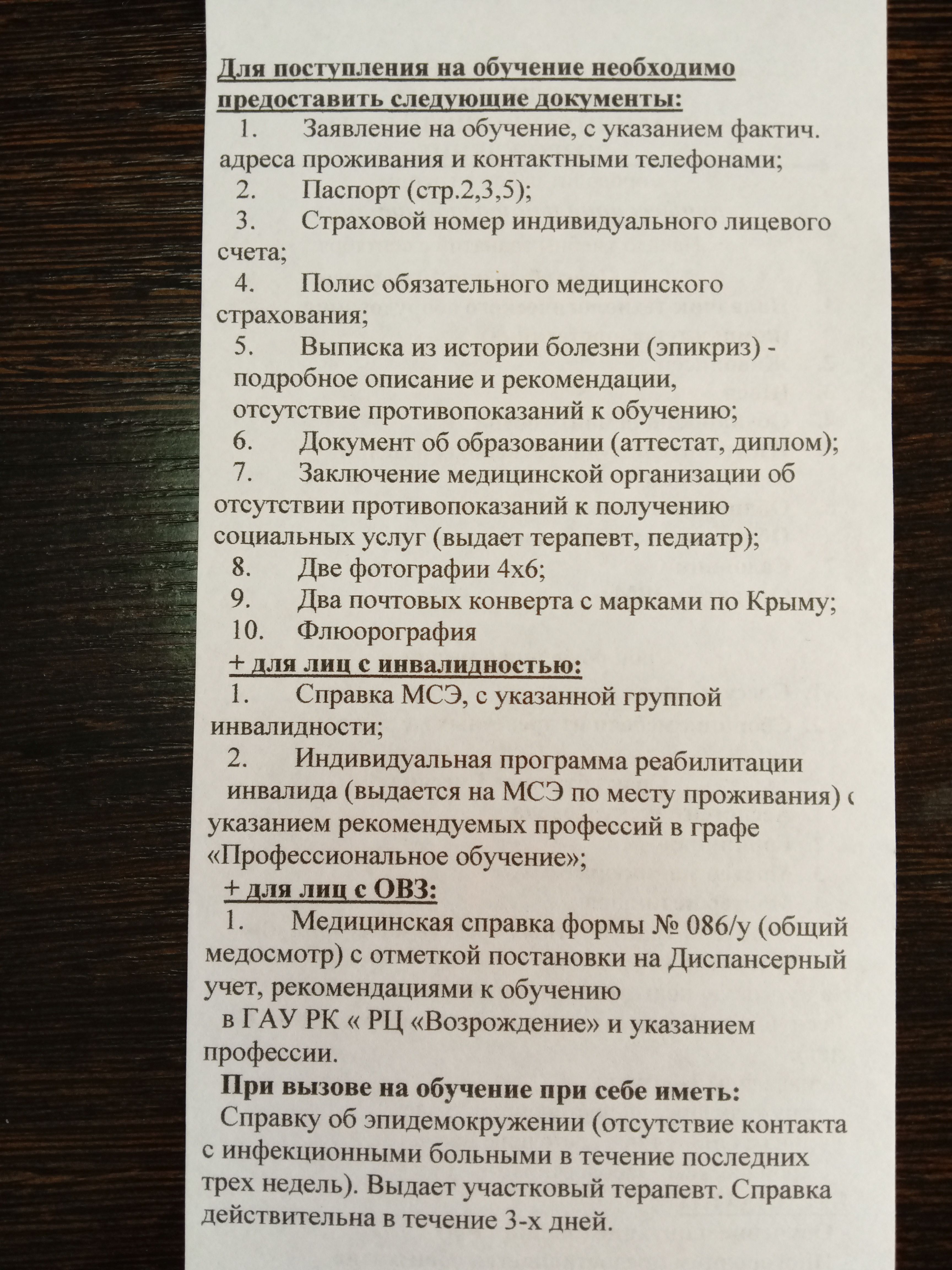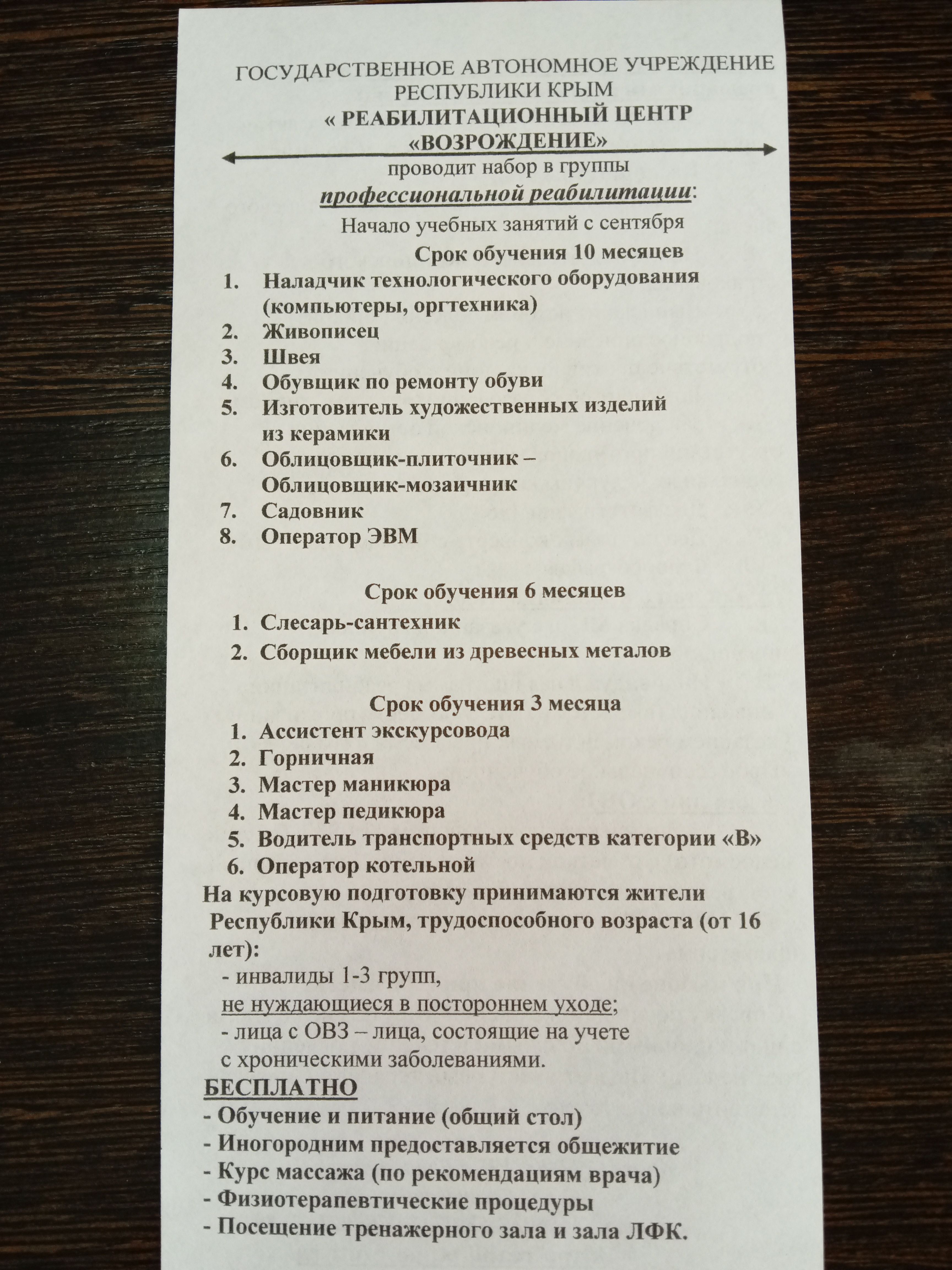 Государственное автономное учреждение Республики Крым "Реабилитационный центр "Возрождение" г. Евпатория проводит набор в группы профессиональной реабилитации людей с инвалидностью либо с ослабленным здоровьем и граждан, находящиеся в трудной жизненной ситуации.