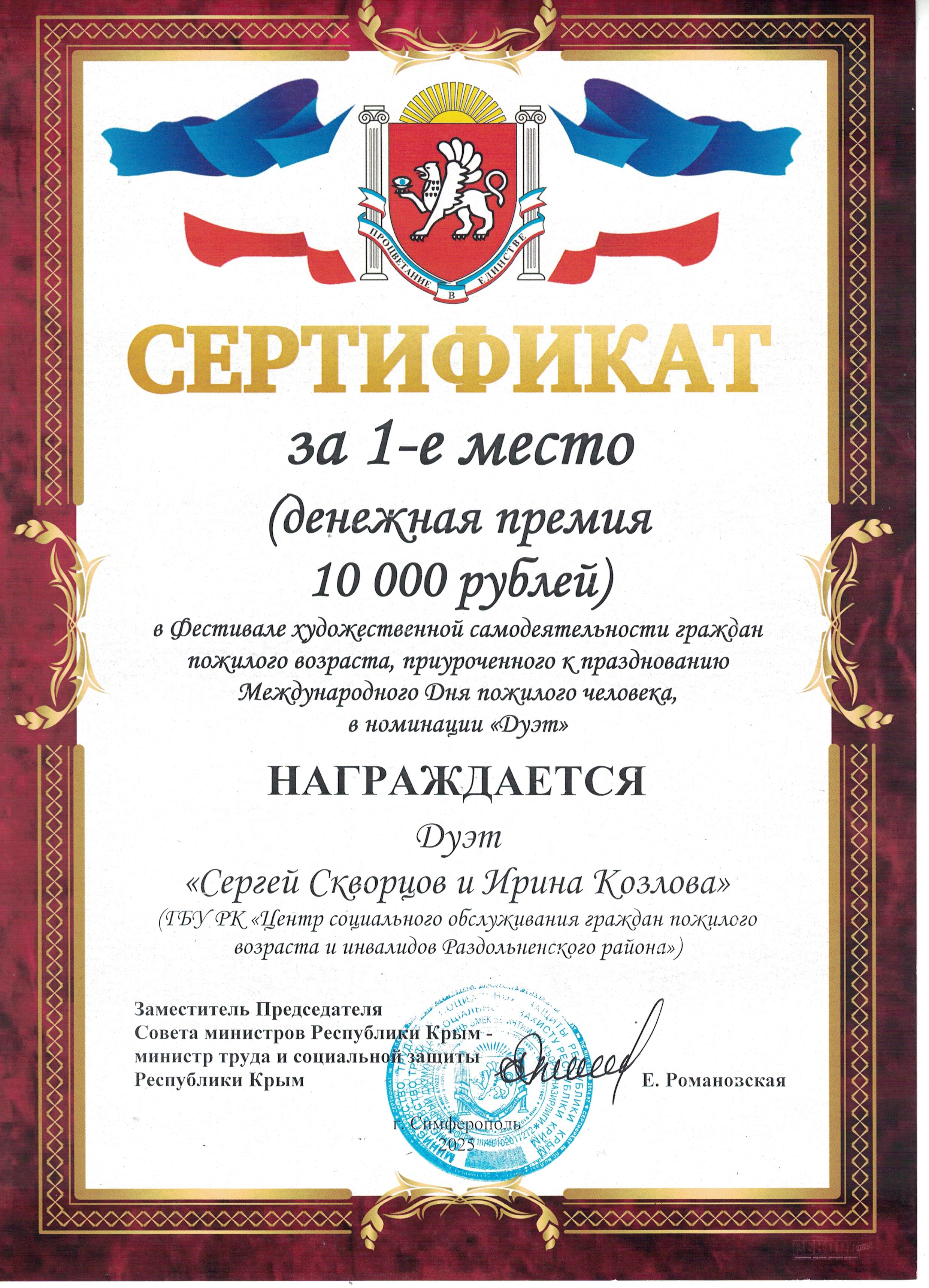 Сергей Скворцов и Ирина Козлова жители Раздольненского района заняли 1 место в Республиканском этапе Фестиваля художественной самодеятельности граждан пожилого возраста, приуроченного к празднованию Международного Дня пожилого человек, в номинации вокальное исполнение «Дуэт».