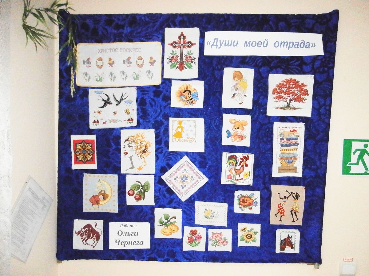 В эти дни в отделении дневного пребывания ГБУ РК «ЦСО Раздольненского района» проходит выставка «Души моей отрада», на которой представлены творческие работы мастера современной вышивки Ольги Чернеги. Ее работы поражают воображение своим разнообразием: среди них есть монохромные картины с интересным сюжетом, красочные натюрморты, яркие цветы, полотна с узорами, персонажи мультфильмов и даже портреты!