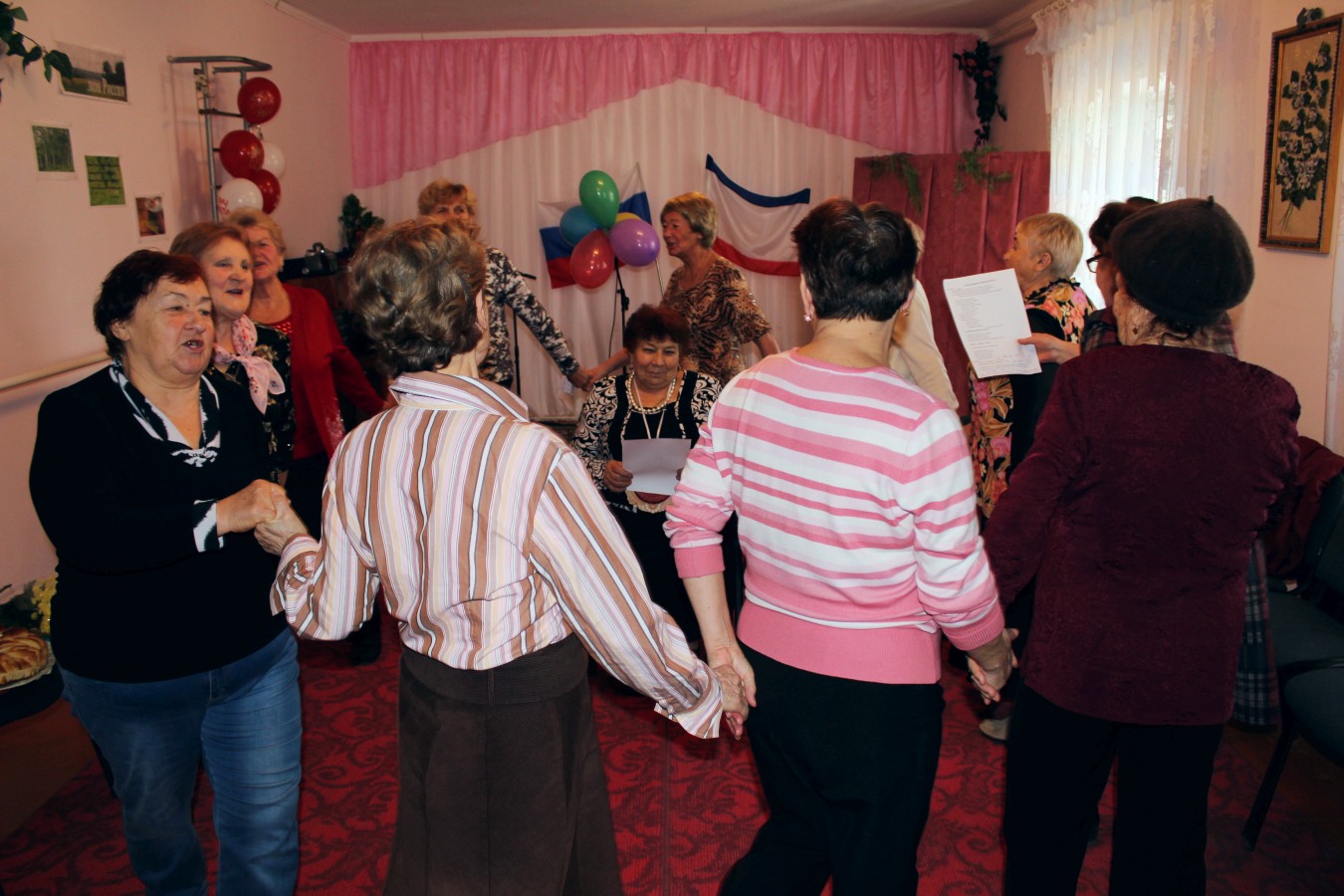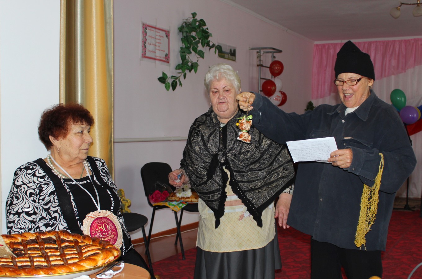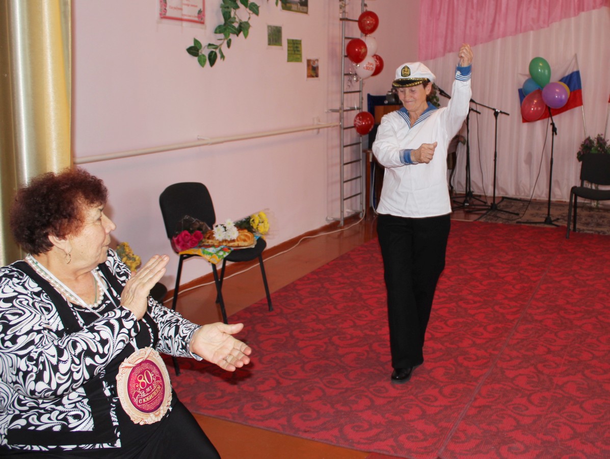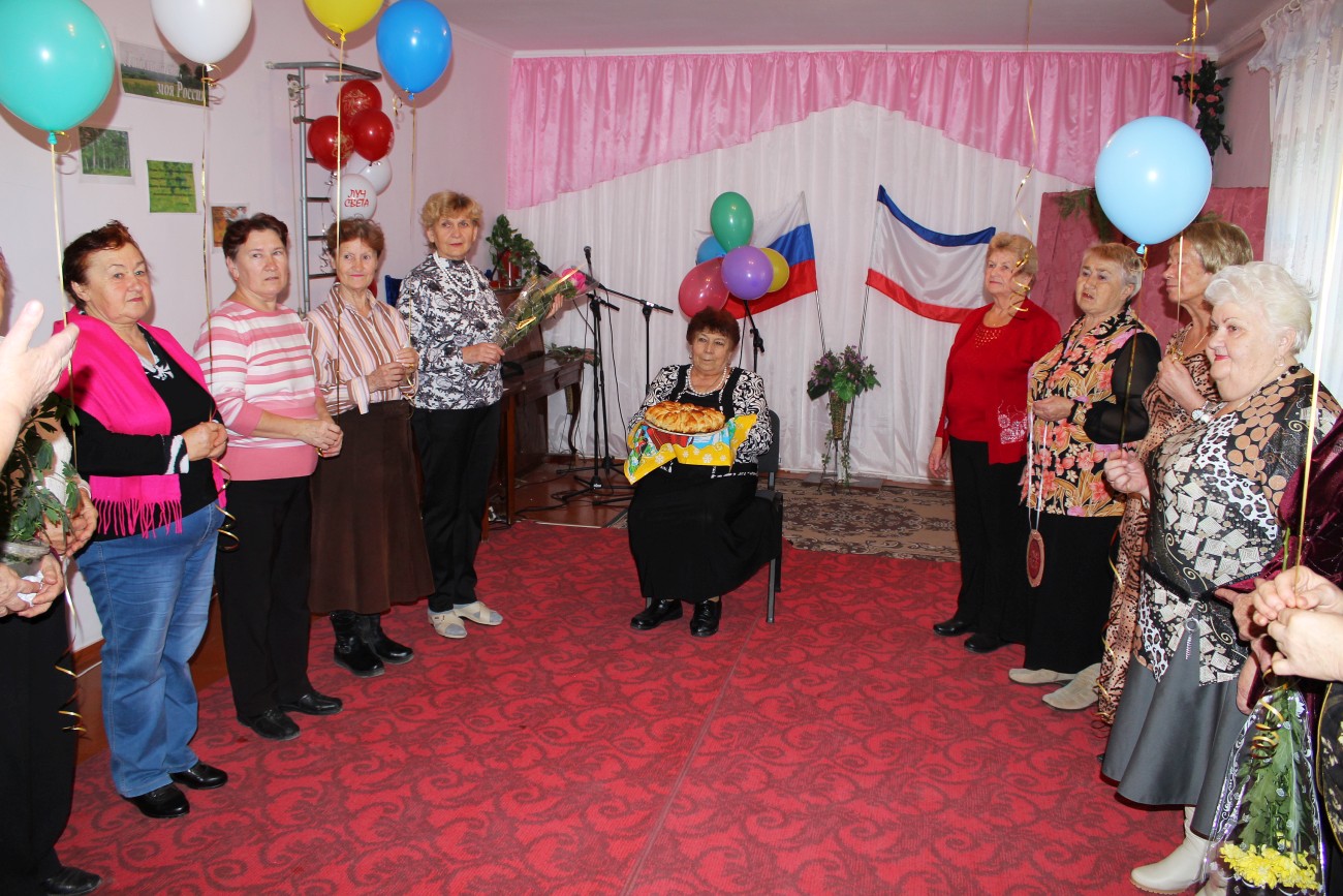 Празднование юбилея проходило в отделении дневного пребывания ГБУ РК «ЦСО Раздольненского района». Участницы ансамбля «Беспокойные сердца» подготовили для именинницы оригинальный сценарий с шуточным «новогодним хороводом», веселыми песнями и юмористическими сценками. Гостей развлекали эмоциональные и колоритные персонажи: «бригада скорой помощи» в исполнении Анны Шумивода и Софии Козак, «бравый моряк» (Зинаида Коркина), «знаменитый певец» (Анна Чорная) и «пара бездомных», которых очень реалистично изобразили Елена Фаустова и Людмила Войтенко.