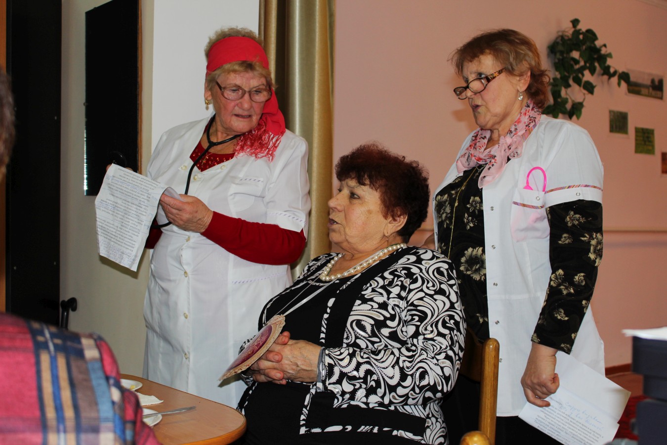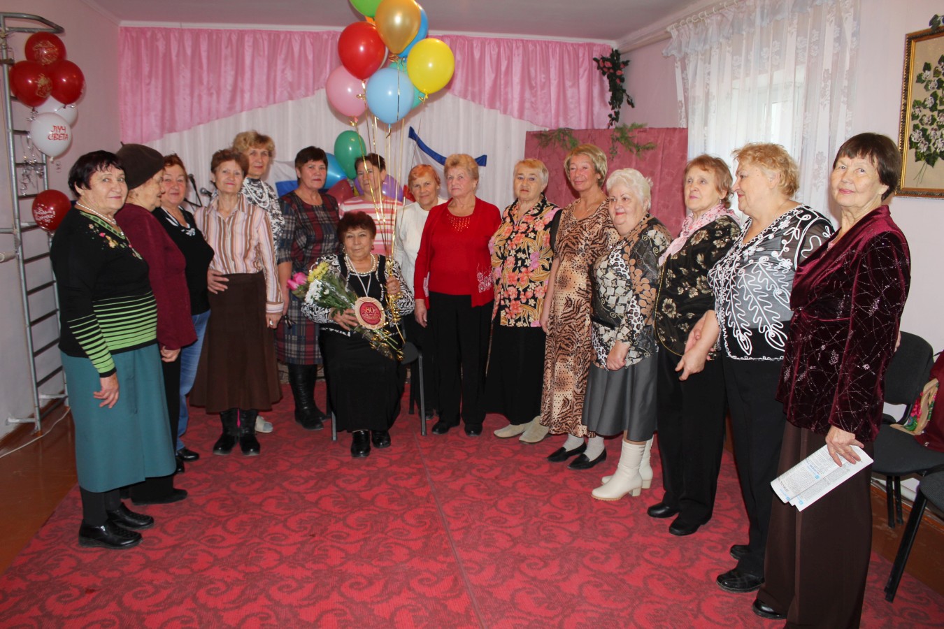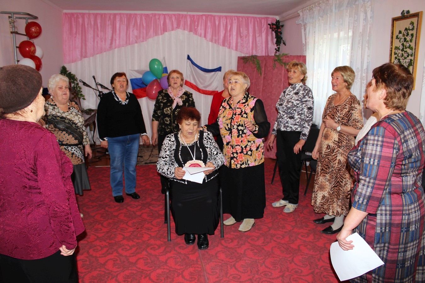 Празднование юбилея проходило в отделении дневного пребывания ГБУ РК «ЦСО Раздольненского района». Участницы ансамбля «Беспокойные сердца» подготовили для именинницы оригинальный сценарий с шуточным «новогодним хороводом», веселыми песнями и юмористическими сценками. Гостей развлекали эмоциональные и колоритные персонажи: «бригада скорой помощи» в исполнении Анны Шумивода и Софии Козак, «бравый моряк» (Зинаида Коркина), «знаменитый певец» (Анна Чорная) и «пара бездомных», которых очень реалистично изобразили Елена Фаустова и Людмила Войтенко.