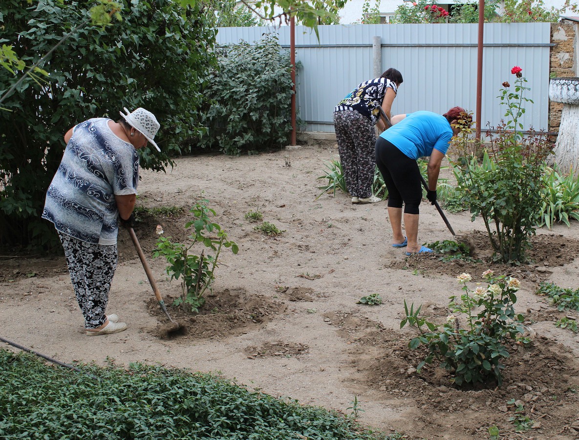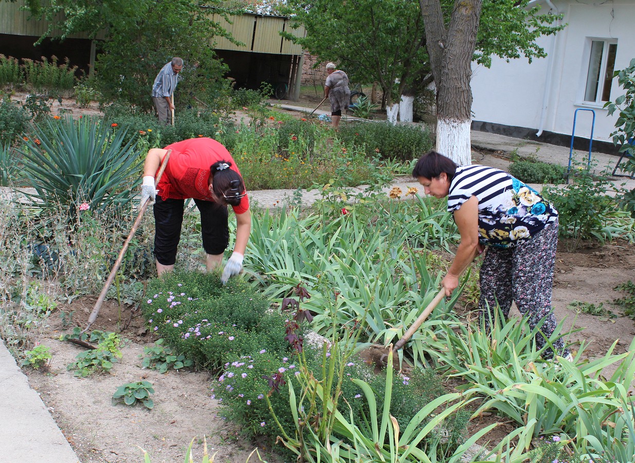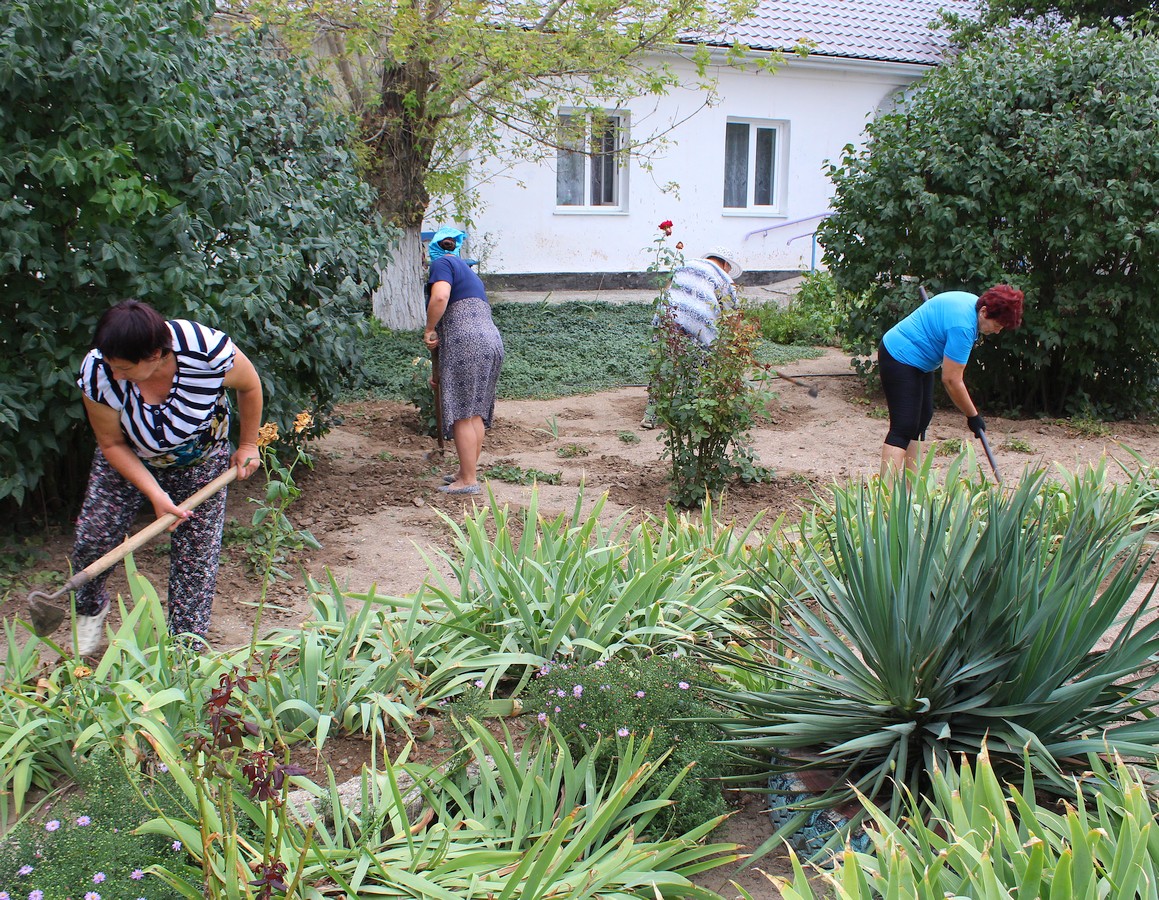 Сотрудники администрации учреждения и социальные работники совместными усилиями провели санитарную уборку на территории Центра социального обслуживания — очистили клумбы от опавшей листвы, пропололи высохшую траву, убрали тротуары и пешеходные дорожки.