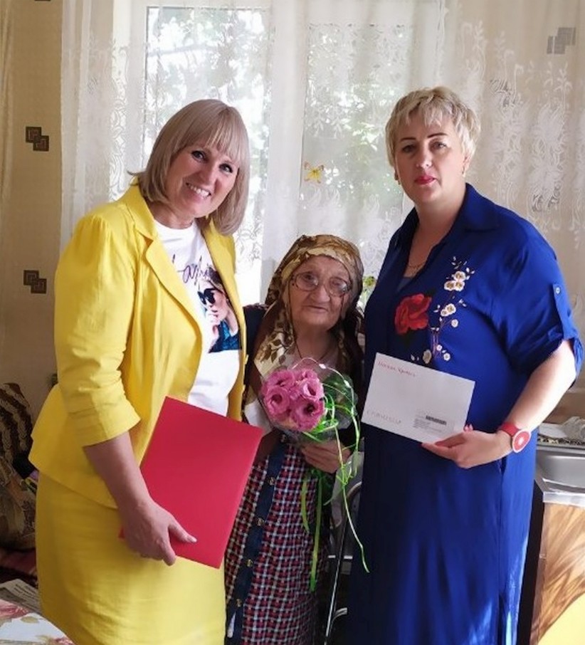 В рамках реализации проекта «Старшее поколение», с этой знаменательной датой именинницу поздравили заместитель главы Администрации Раздольненского района Ольга Ломоносова и заместитель директора Государственного бюджетного учреждения Республики Крым «Центр социального обслуживания граждан пожилого возраста и инвалидов Раздольненского района» Нина Гращенко.