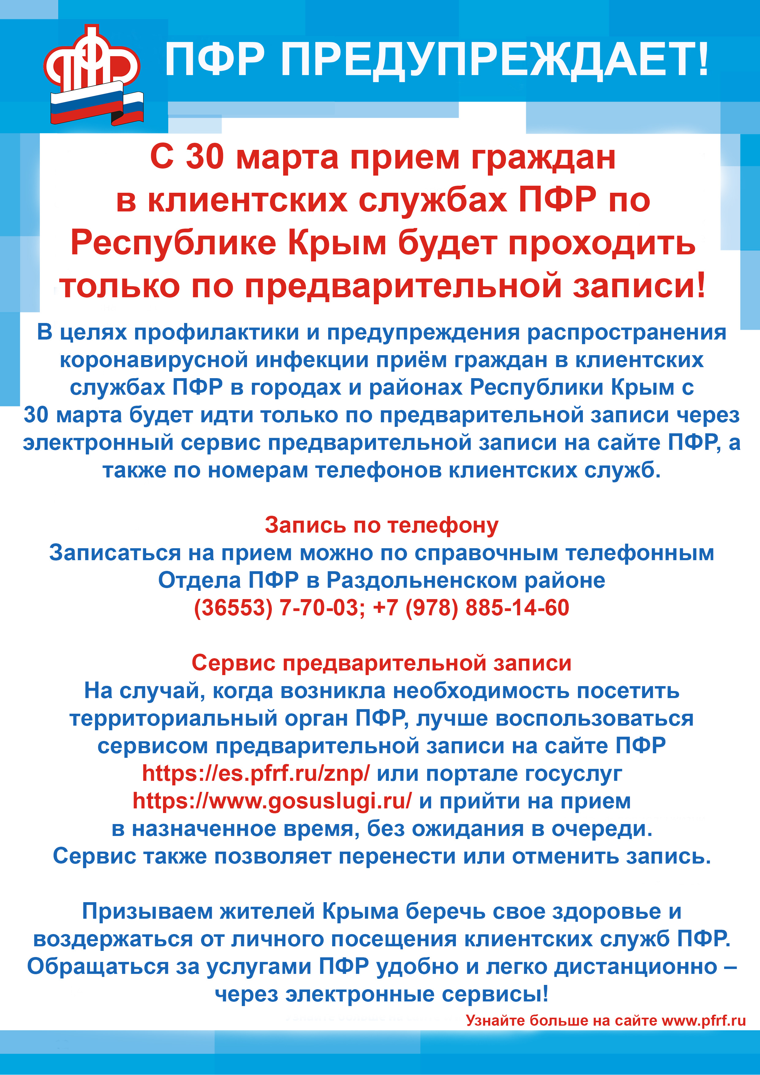 С 30 марта прием граждан в клиентских службах ПФР по Республике Крым будет проходить только по предварительной записи!